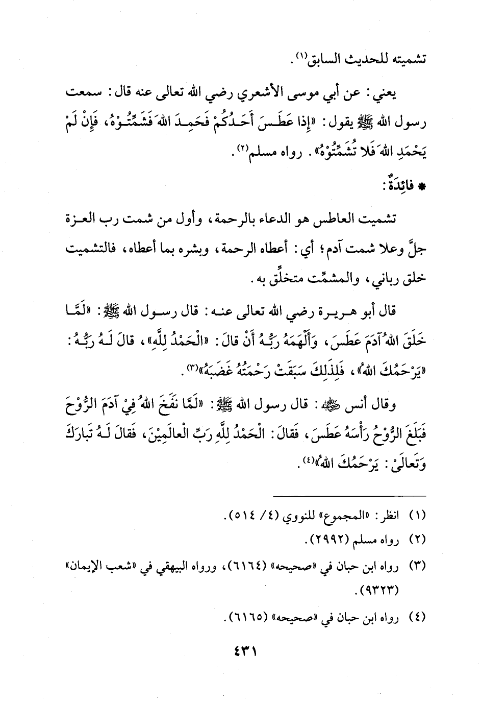 يعني: عن أبي موسى الأشعري رضي الله تعالى عنه قال: سمعت رسول الله - صلى الله عليه وسلم - يقول: "إِذا عَطَسَ أَحَدُكُمْ فَحَمِدَ اللهَ فَشِّمتُوْهُ، فَإِنْ لَمْ يَحْمَدِ اللهَ فَلا تُشَمِّتُوْهُ". رواه مسلم (¬2).