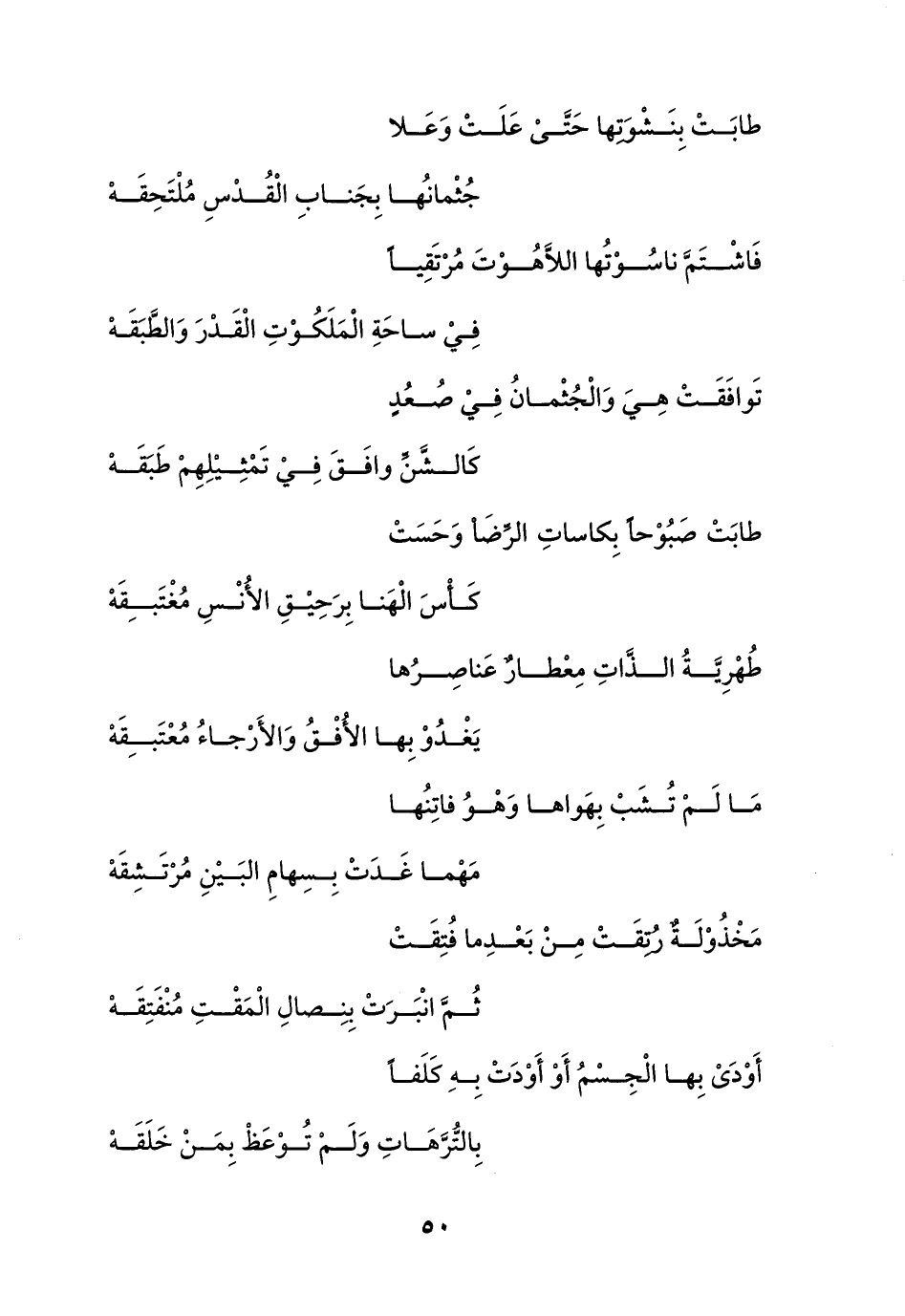 فَاشْتَمَّ ناسُوْتُها اللاَّهُوْتَ مُرْتَقِياً ... فِيْ ساحَةِ الْمَلَكُوْتِ الْقَمْرَ وَالطَّبَقَهْ