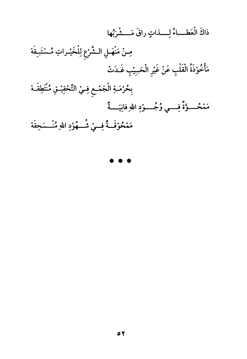 مَمْحُوَّةٌ فِي وُجُوْدِ اللهِ فانِيَةٌ .... مَمْحُوْقَةٌ فِيْ شُهُوْدِ اللهِ مُنْسَحِقَهْ