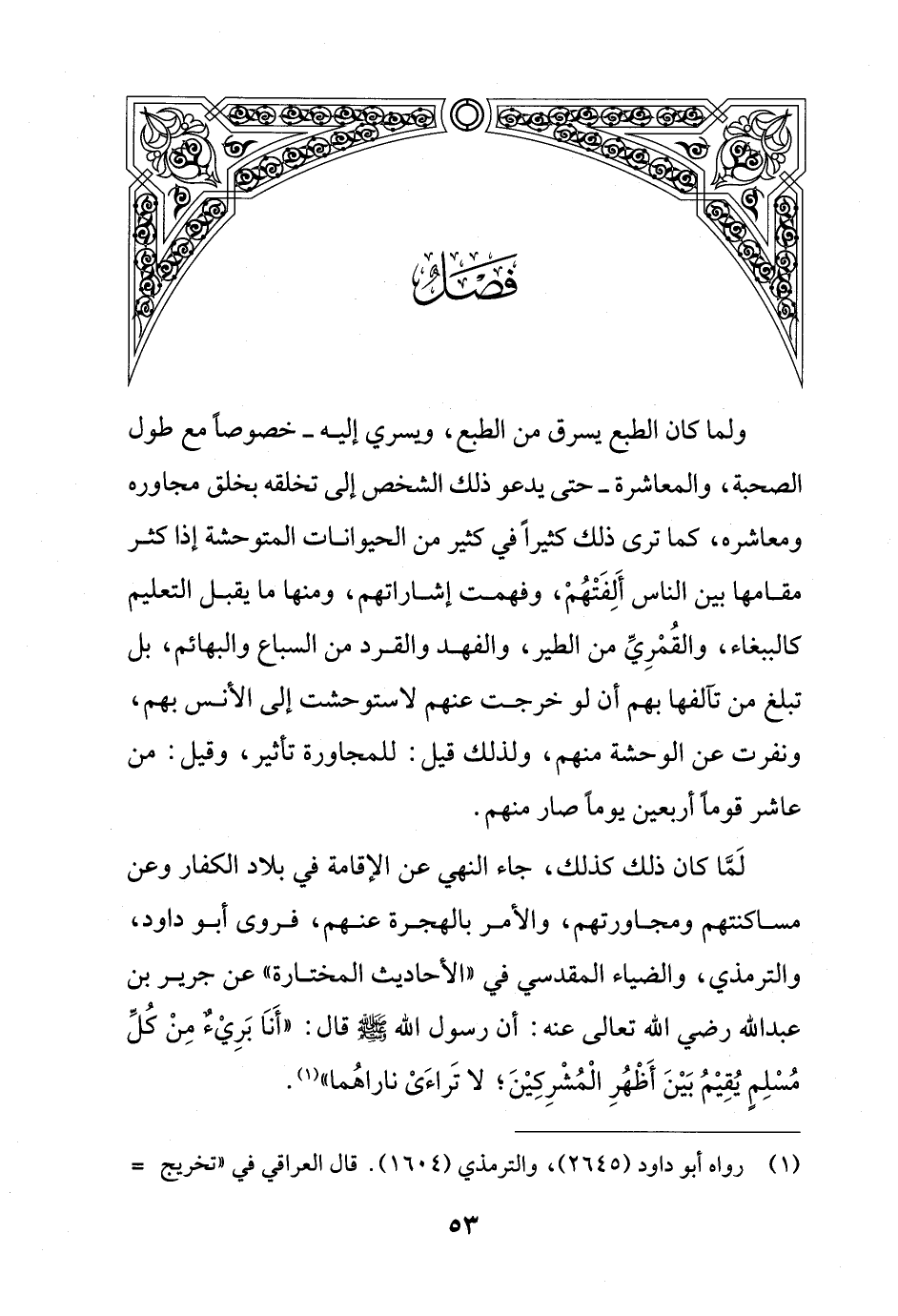 لَمَّا كان ذلك كذلك، جاء النهي عن الإقامة في بلاد الكفار وعن مساكنتهم ومجاورتهم، والأمر بالهجرة عنهم، فروى أبو داود، والترمذي، والضياء المقدسي في "الأحاديث المختارة" عن جرير بن عبد الله رضي الله تعالى عنه: أن رسول الله - صلى الله عليه وسلم - قال: "أَنَا بَرِيْءٌ مِنْ كُلِّ مُسْلِمٍ يُقِيْمُ بَيْنَ أَظْهُرِ الْمُشْرِكِيْنَ؛ لا تَراءَىْ ناراهُما" (¬1).