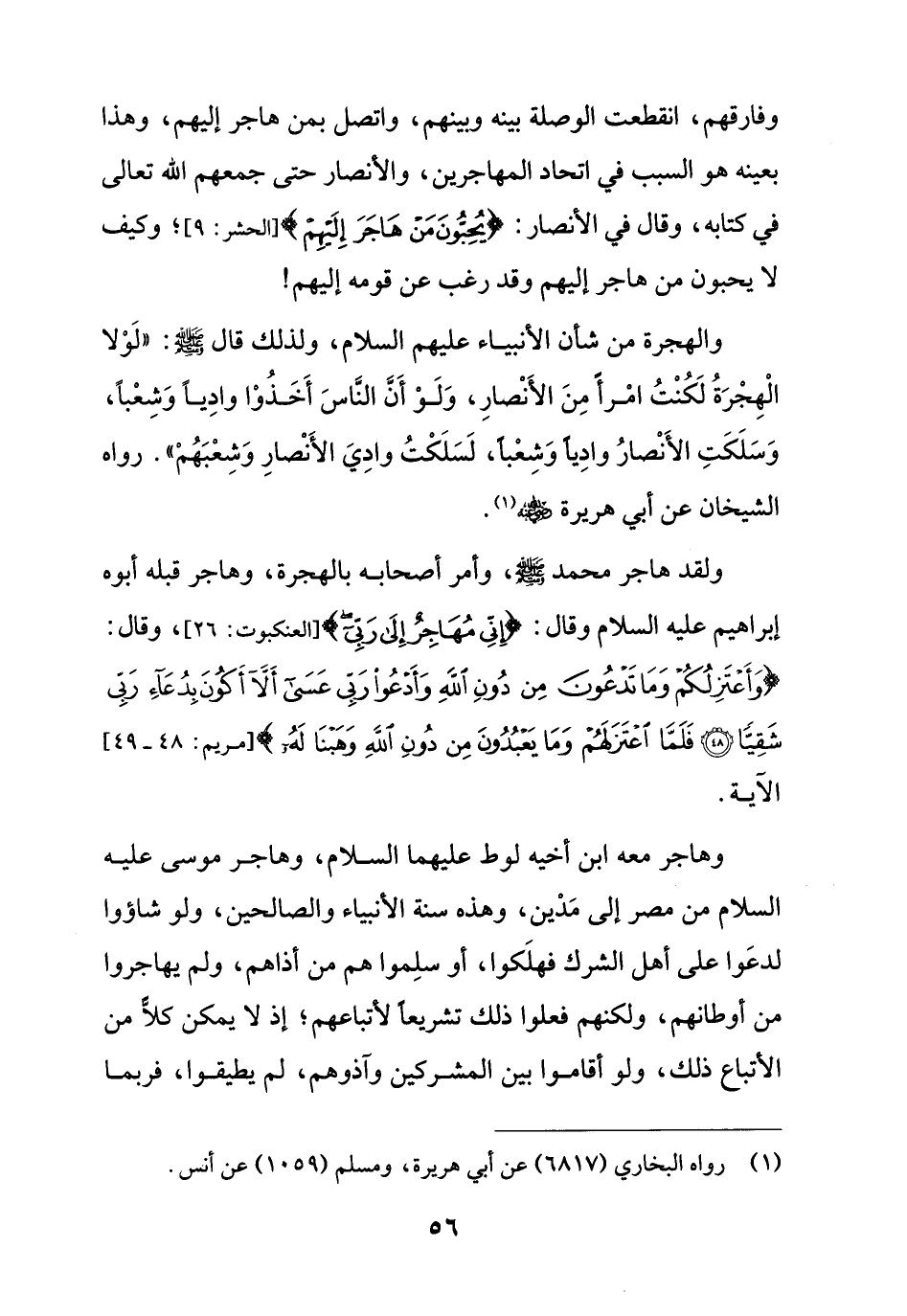 والهجرة من شأن الأنبياء عليهم السلام، ولذلك قال - صلى الله عليه وسلم -: "لَوْلا الْهِجْرَةُ لَكُنْتُ امْرأً مِنَ الأَنْصارِ، وَلَوْ أَنَّ النَاسَ أَخَذُوْا وادِياً وَشِعْباً، وَسَلَكَتِ الأَنْصارُ وادِيًا وَشِعْبًا، لَسَلَكْتُ وادِيَ الأَنْصارِ وَشِعْبَهُمْ". رواه الشيخان عن أبي هريرة - رضي الله عنه - (¬1).