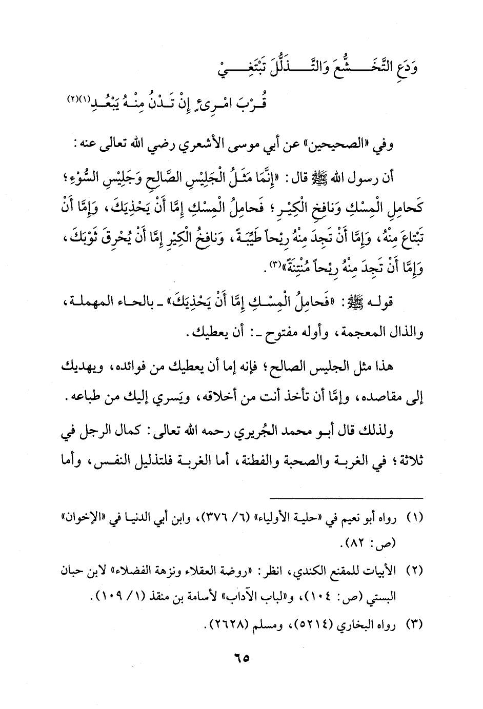 أن رسول الله - صلى الله عليه وسلم - قال: "إِنَّمَا مَثَلُ الْجَلِيْسِ الصَّالح وَجَلِيْسِ السُّوْءِ؛ كَحامِلِ الْمِسْكِ وَنافِخ الْكِيْرِ؛ فَحامِلُ الْمِسْكِ إِمَّا أَنْ يَحْذِيَكَ، وَإِمَّا أَنْ تَبْتاعَ مِنْهُ، وإمَّا أَنْ تَجِدَ مِنْهُ ريحاً طَيِّبَةً، وَنافخُ الْكِيْرِ إِمَّا أَنْ يُحْرِقَ ثَوْبَكَ، وإِمَّا أَنْ تَجِدَ مِنْهُ ريْحاً مُنْتِنَةً" (¬3).