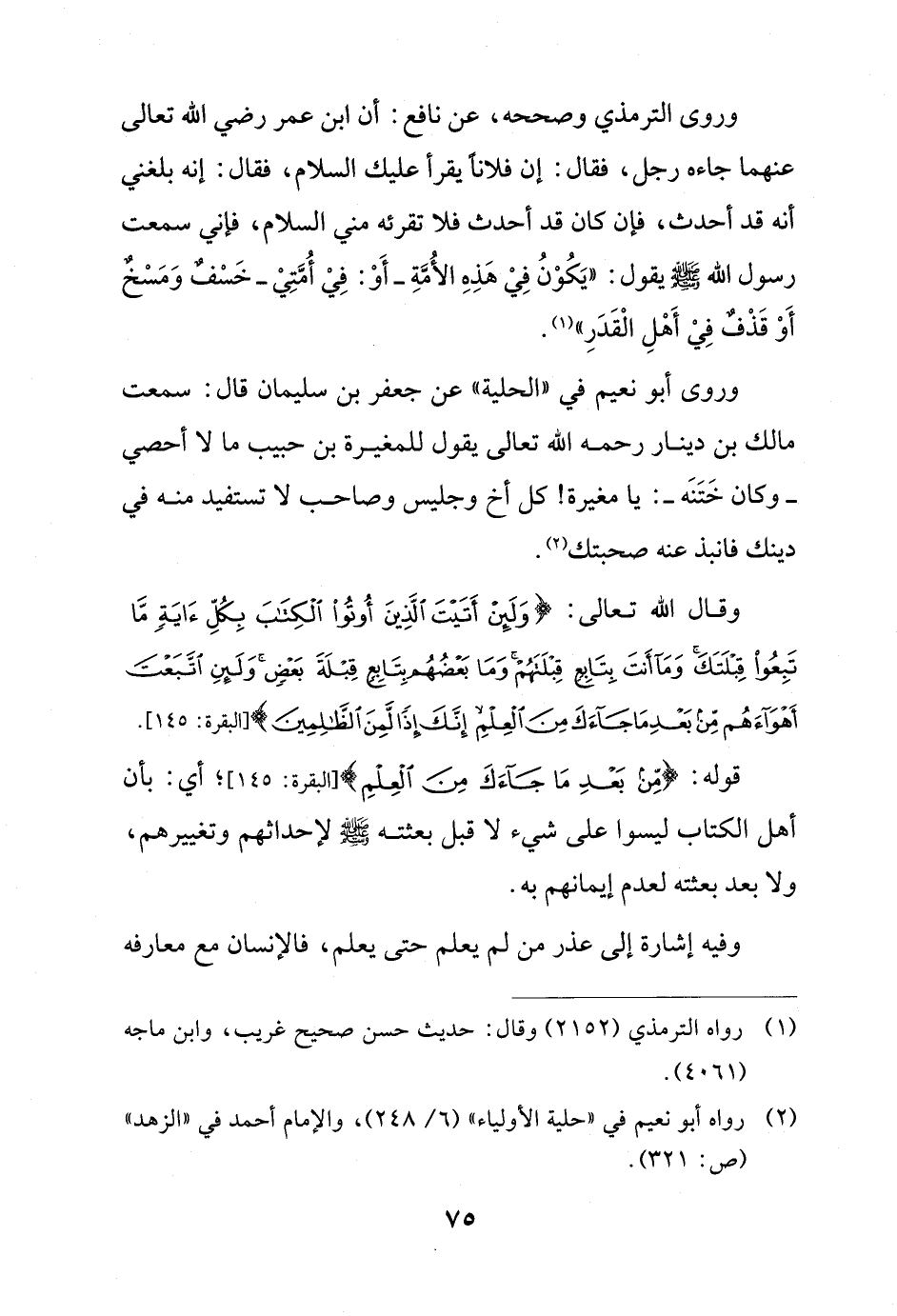 وروى الترمذي وصححه، عن نافع: أن ابن عمر رضي الله تعالى عنهما جاءه رجل، فقال: إن فلاناً يقرأ عليك السلام، فقال: إنه بلغني أنه قد أحدث، فإن كان قد أحدث فلا تقرئه مني السلام، فإني سمعت رسول الله - صلى الله عليه وسلم - يقول: "يَكوْن فِيْ هَذِهِ الأمَّةِ - أَوْ: فِيْ أمتِيْ - خَسْفٌ وَمَسْخٌ أَوْ قَذْفٌ فِيْ أَهْلِ الْقَدَرِ" (¬1).