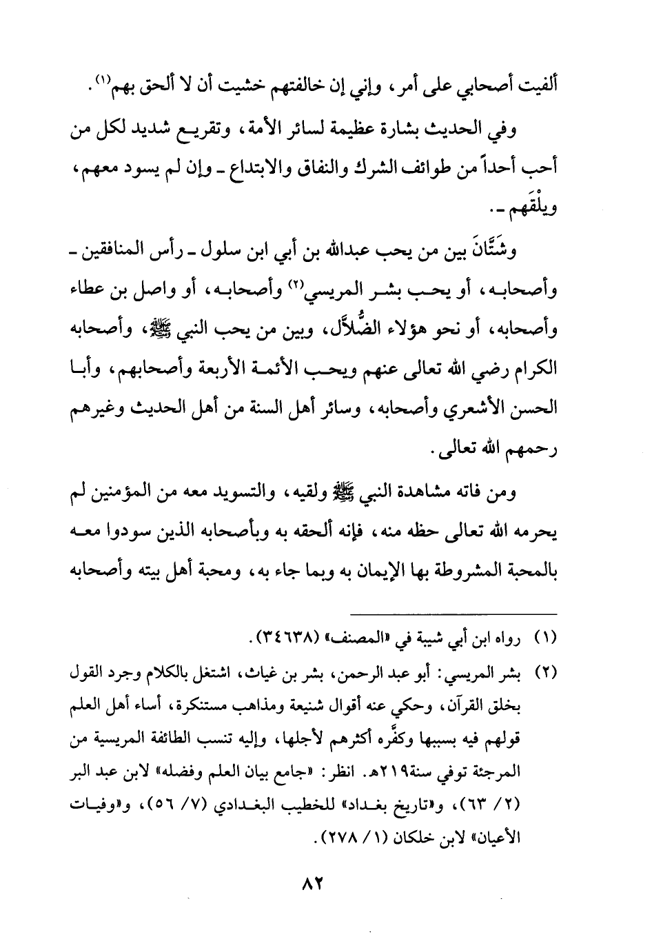 (¬2) بشر المريسي: أبو عبد الرحمن، بشر بن غياث، اشتغل بالكلام وجرد القول بخلق القرآن، وحكي عنه أقوال شنيعة ومذاهب مستنكرة، أساء أهل العلم قولهم فيه بسببها وكفَّره كثرهم لأجلها، وإليه تنسب الطائفة المريسية من المرجئة توفي سنة 219 هـ. انظر: "جامع بيان العلم وفضله" لابن عبد البر (2/ 63)، و"تاريخ بغداد" للخطيب البغدادي (7/ 56)، و "وفيات الأعيان" لابن خلكان (1/ 278).