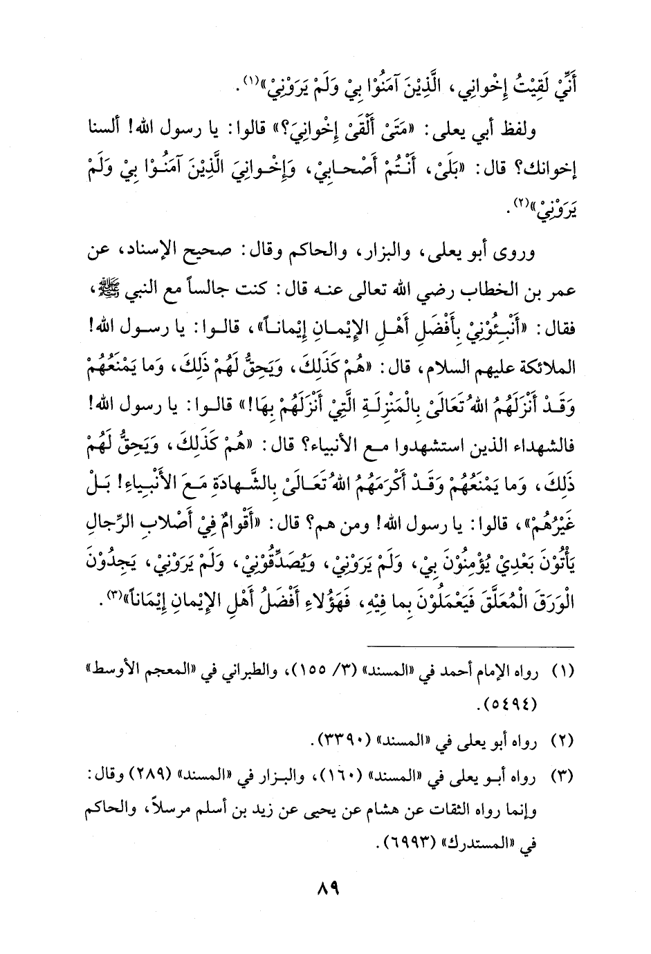 وروى أبو يعلى، والبزار، والحاكم وقال: صحيح الإسناد، عن عمر بن الخطاب رضي الله تعالى عنه قال: كنت جالساً مع النبي - صلى الله عليه وسلم -، فقال: "أَنْبِئُوْنِيْ بِأَفْضَلِ أَهْلِ الإِيْمانِ إِيْماناً"، قالوا: يا رسول الله! الملائكة عليهم السلام، قال: "هُمْ كَذَلِكَ، وَيحِقُّ لَهُمْ ذَلِكَ، وَما يَمْنَعُهُمْ وَقَدْ أَنْزَلَهُمُ اللهُ تَعَالَىْ بِالْمَنْزِلَةِ الَّتِيْ أَنْزَلَهُمْ بِهَا! " قالوا: يا رسول الله! فالشهداء الذين استشهدوا مع الأنبياء؟ قال: "هُمْ كَذَلِكَ، وَيَحِقُّ لَهُمْ ذَلِكَ، وَما يَمْنَعُهُمْ وَقَدْ أَكْرَمَهُمُ اللهُ تَعَالَىْ بِالشَّهادةِ مَعَ الأَنْبِياءِ! بَلْ غَيْرُهُمْ"، قالوا: يا رسول الله! ومن هم؟ قال: "أَقْوامٌ فِيْ أَصْلابِ الرِّجالِ يَأْتُوْنَ بَعْدِيْ يُؤْمِنُوْنَ بِيْ، وَلَمْ يَرَوْنيْ، وُيصَدِّقُوْنيْ، وَلَمْ يَرَوْنيْ، يَجِدُوْنَ الْوَرَقَ الْمُعَلَّقَ فَيَعْمَلُوْنَ بِما فِيْهِ، فَهَؤُلاءِ أَفْضَلُ أَهْلِ الإِيْمانِ إِيْمَاناً" (¬3).
