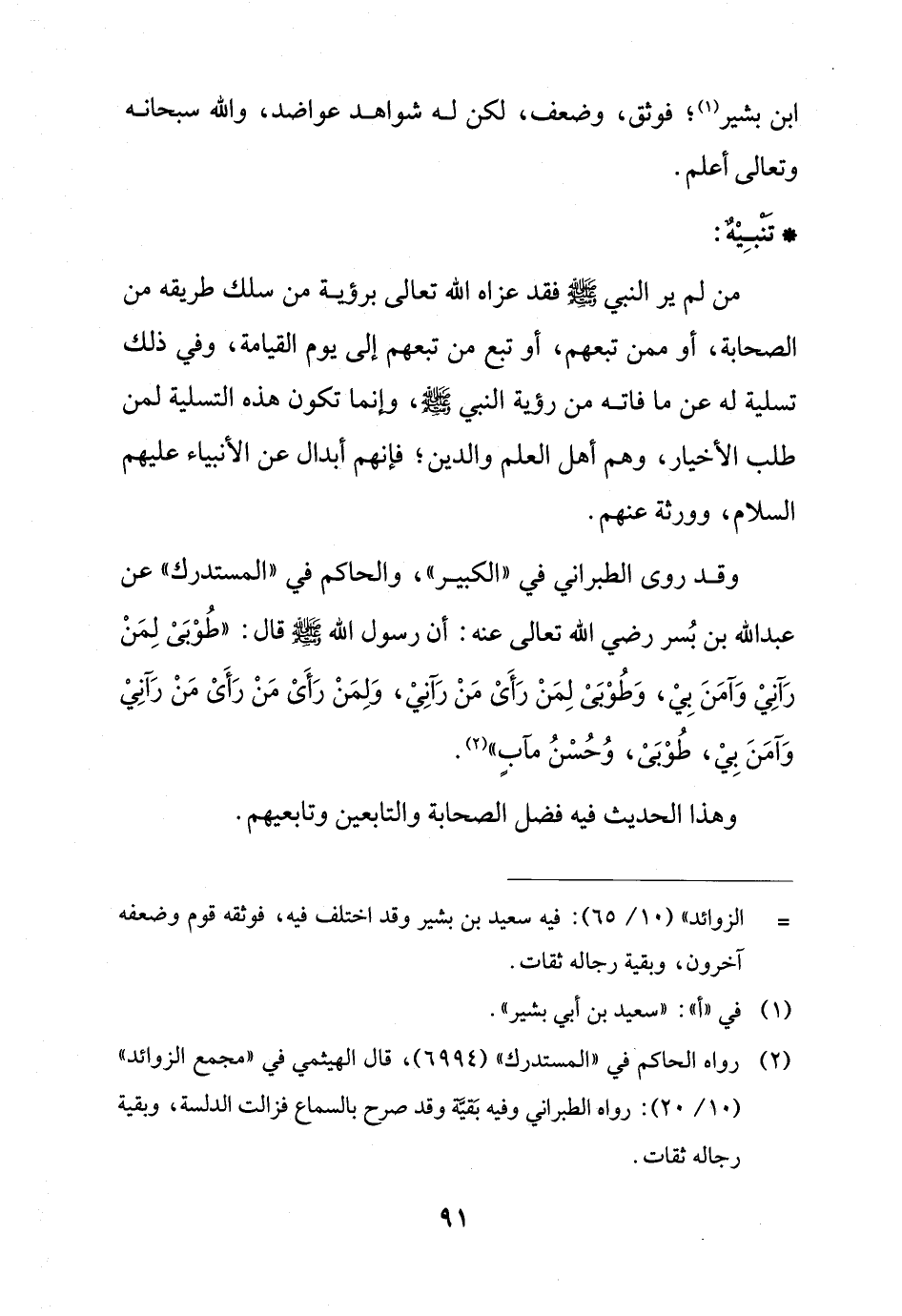 وقد روى الطبراني في "الكبير"، والحاكم في "المستدرك" عن عبد الله بن بُسر رضي الله تعالى عنه: أن رسول الله - صلى الله عليه وسلم - قال: "طُوْبَىْ لِمَنْ رَآنِيْ وَآَمَنَ بِيْ، وَطُوْبَىْ لِمَنْ رَأَىْ مَنْ رَآَنِيْ، وَلِمَنْ رَأَىْ مَنْ رَأَىْ مَنْ رَآنِيْ وَآمَنَ بِيْ، طُوْبَىْ، وُحُسْنُ مآبٍ" (¬2).