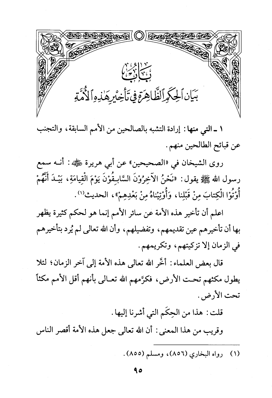 بَابُ بَيَان الحِكَمِ الظَّاهِرَة فِي تَأخِيرِ هَذِهِ الأُمَّةِ