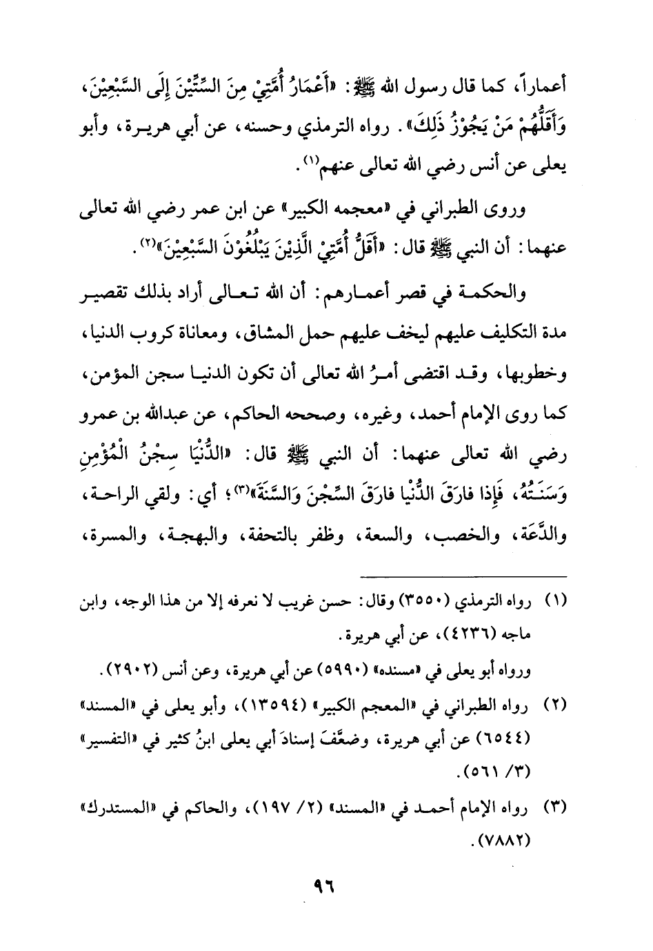 وروى الطبراني في "معجمه الكبير" عن ابن عمر رضي الله تعالى عنهما: أن النبي - صلى الله عليه وسلم - قال: "أقل أُمَّتِيْ الَّذِيْنَ يَبْلُغُوْنَ السَّبْعِيْنَ" (¬2).