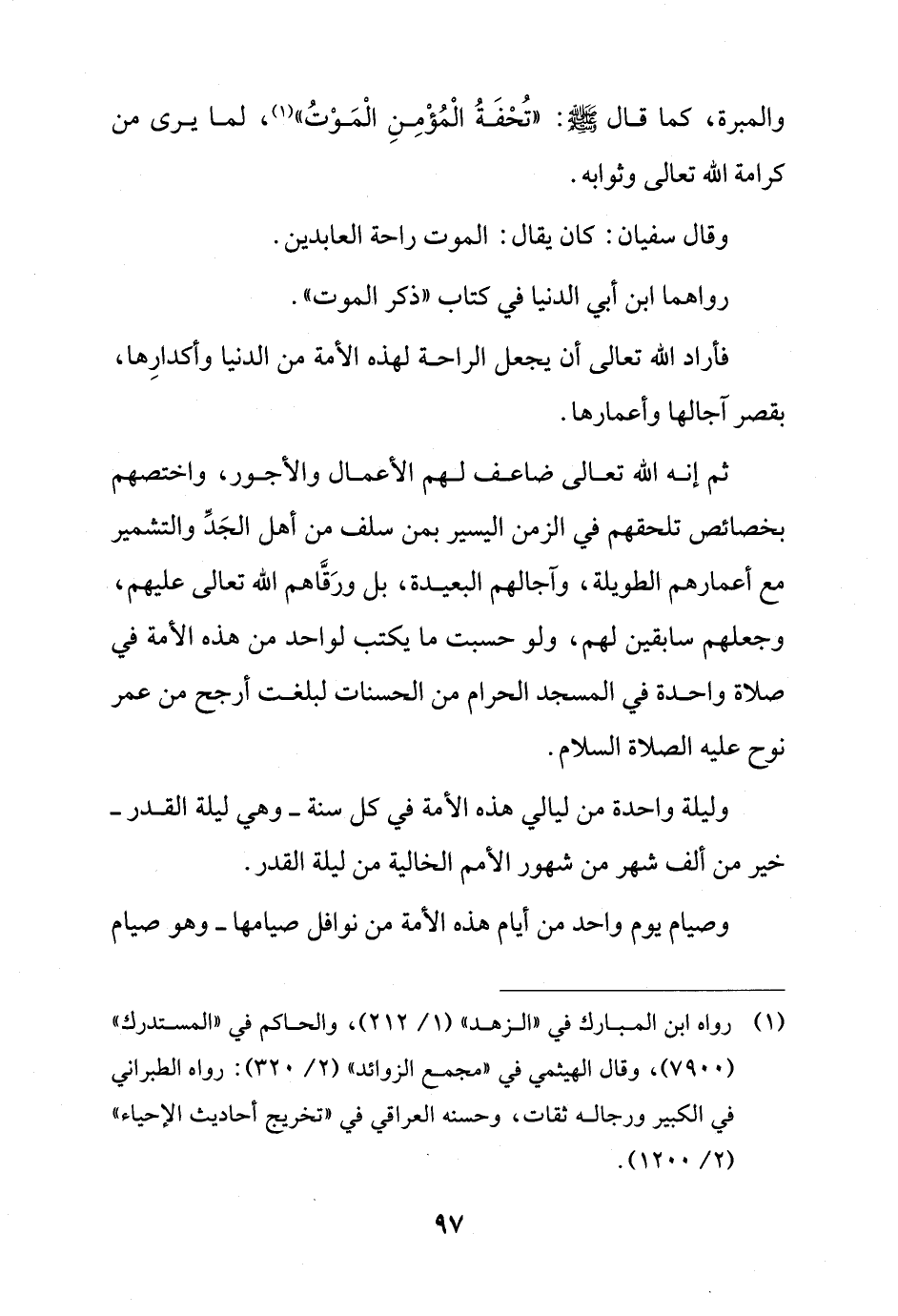 ثم إنه الله تعالى ضاعف لهم الأعمال والأجور، واختصهم بخصائص تلحقهم في الزمن اليسير بمن سلف من أهل الجَدِّ والتشمير مع أعمارهم الطويلة، وآجالهم البعيدة، بل ورَقَّاهم الله تعالى عليهم، وجعلهم سابقين لهم، ولو حسبت ما يكتب لواحد من هذه الأمة في صلاة واحدة في المسجد الحرام من الحسنات لبلغت أرجح من عمر نوح عليه الصلاة السلام.