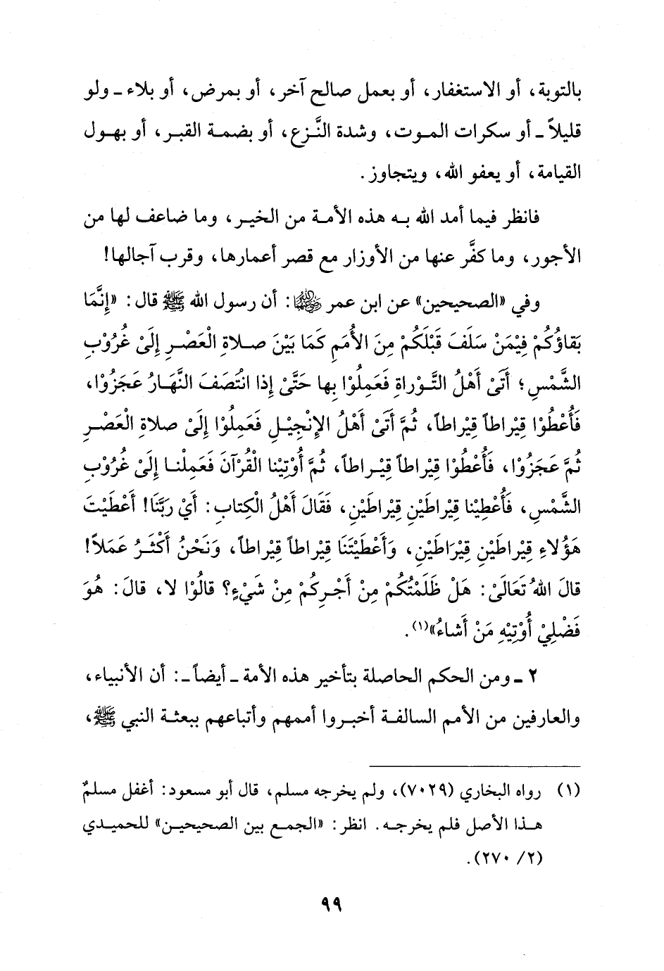 وفي "الصحيحين" عن ابن عمر - رضي الله عنهما -: أن رسول الله - صلى الله عليه وسلم - قال: "إِنَّمَا بَقاؤُكُمْ فِيْمَنْ سَلَفَ قَبْلَكُمْ مِنَ الأُمَمِ كَمَا بَيْنَ صلاةِ الْعَصْرِ إِلَىْ غُرُوْبِ الشَّمْسِ؛ أتىْ أَهْلُ التَّوْراةِ فَعَمِلُوْا بِها حَتَّىْ إِذا انتصَفَ النَّهَارُ عَجَزُوْا، فَأُعْطُوْا قِيْراطاً قِيْراطاً، ثُمَّ أتىْ أَهْلُ الإِنْجِيْلِ فَعَمِلُوْا إِلَىْ صلاةِ الْعَصْرِ ثُمَّ عَجَزُوْا، فَأُعْطُوْا قِيْراطاً قِيْراطاً، ثُمَّ أُوْتيْنا الْقُرآنَ فَعَمِلْنا إِلَىْ غُرُوْبِ الشَّمْسِ، فَأُعْطِيْنا قِيْراطَيْنِ قِيْراطَيْنِ، فَقَالَ أَهْلُ الْكِتابِ: أَيْ رَبَّنَا! أَعْطَيْتَ هَؤُلاءِ قِيْراطَيْنِ قِيْرَاطَيْنِ، وَأَعْطَيْتَنَا قِيْراطاً قِيْراطًا، وَنَحْنُ أَكْثَرُ عَمَلاً! قالَ اللهُ تَعَالَىْ: هَلْ ظَلَمْتُكُمْ مِنْ أَجْرِكُمْ مِنْ شَيْءٍ؟ قالُوْا لا، قالَ: هُوَ فَضْلِيْ أُوْتيْهِ مَنْ أَشاءُ" (¬1).