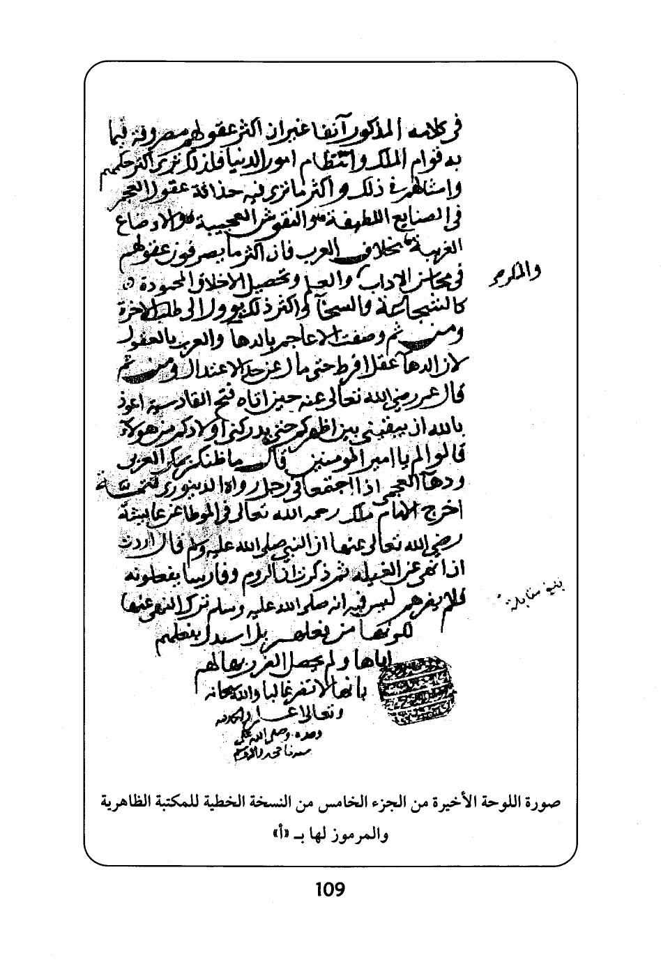 صورة اللوحة الأخيرة من الجزء الخامس من النسخة الخطية للمكتبة الظاهرية والمرموز لها بـ"أ"