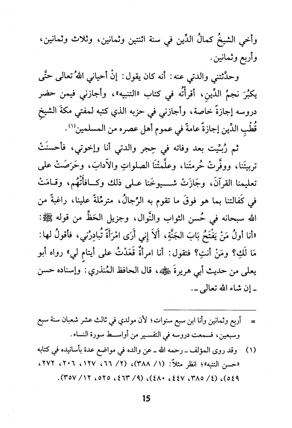 وحدَّثتني والدتي عنه: أنه كان يقول: إنْ أحياني اللهُ تعالى حتَّى يكبُرَ نجمُ الدِّينِ، أقرأْتُه في كتاب "التنبيه"، وأجازني فيمن حضر دروسه إجازةً خاصة، وأجازني في حزبه الذي كتبه لمفتي مكةَ الشيخِ قُطْبِ الدِّين إجازةً عامةً في عموم أهل عصره من المسلمين (¬1).