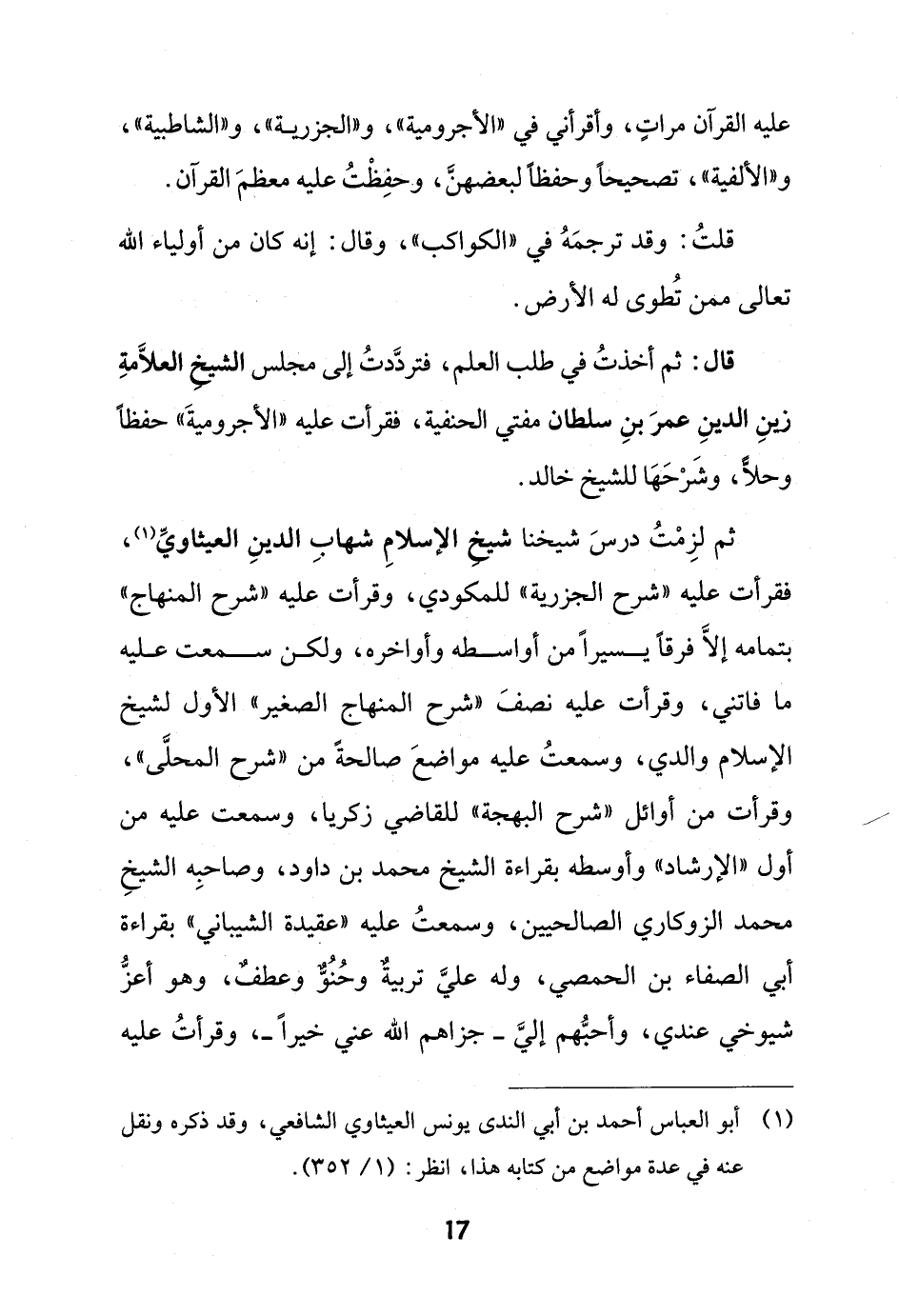 ثم لزِمْتُ درسَ شيخنا شيخ الإسلامِ شهابِ الدينِ العيثاويِّ (¬1)، فقرأت عليه "شرح الجزرية" للمكودي، وقرأت عليه "شرح المنهاج" بتمامه إلَّا فرقاً يسيراً من أواسطه وأواخره، ولكن سمعت عليه ما فاتني، وقرأت عليه نصفَ "شرح المنهاج الصغير" الأول لشيخ الإسلام والدي، وسمعتُ عليه مواضعَ صالحةً من "شرح المحلَّى"، وقرأت من أوائل "شرح البهجة" للقاضي زكريا، وسمعت عليه من أول "الإرشاد" وأوسطه بقراءة الشيخ محمد بن داود، وصاحبِه الشيخِ محمد الزوكاري الصالحيين، وسمعتُ عليه "عقيدة الشيباني" بقراءة أبي الصفاء بن الحمصي، وله عليَّ تربية وحُنُوٌّ وعطفٌ، وهو أعزُّ شيوخي عندي، وأحبُّهم إليَّ - جزاهم الله عني خيراً -، وقرأتُ عليه