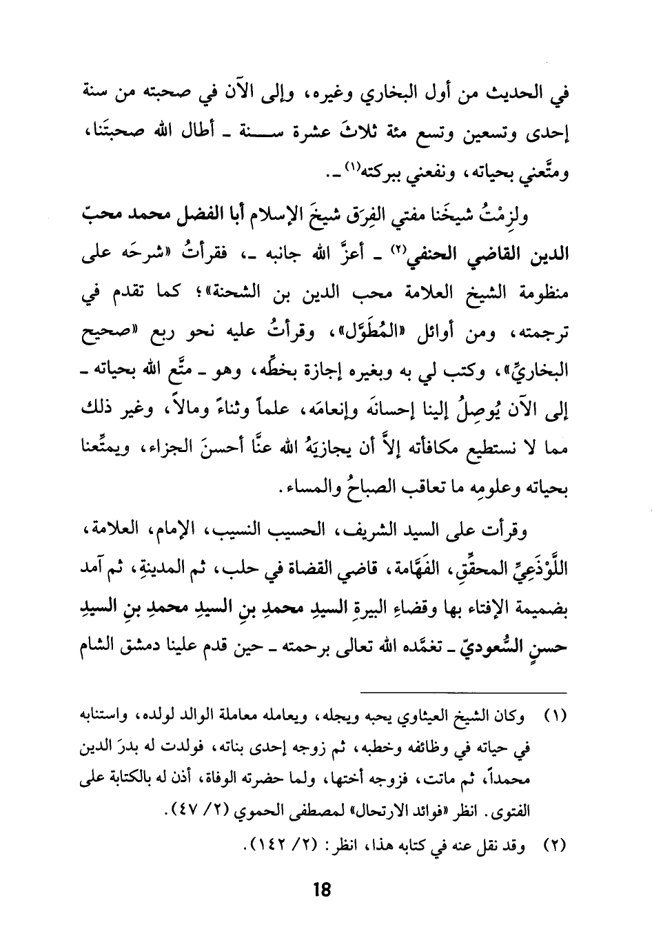 ولزِمْتُ شيخَنا مفتي الفِرَق شيخَ الإسلام أبا الفضل محمد محبّ الدين القاضي الحنفي (¬2) - أعزَّ الله جانبه -، فقرأتُ "شرحَه على منظومة الشيخ العلامة محب الدين بن الشحنة"؛ كما تقدم في ترجمته، ومن أوائل "المُطَوَّل"، وقرأتُ عليه نحو ربع "صحيح البخاريِّ"، وكتب لي به وبغيره إجازة بخطِّه، وهو - متَّع الله بحياته - إلى الآن يُوصِلُ إلينا إحسانَه وإنعامَه، علماً وثناءً ومالاً، وغير ذلك مما لا نستطيع مكافأته إلَّا أن يجازيَهُ الله عنَّا أحسنَ الجزاء، ويمتِّعنا بحياته وعلومِه ما تعاقب الصباحُ والمساء.