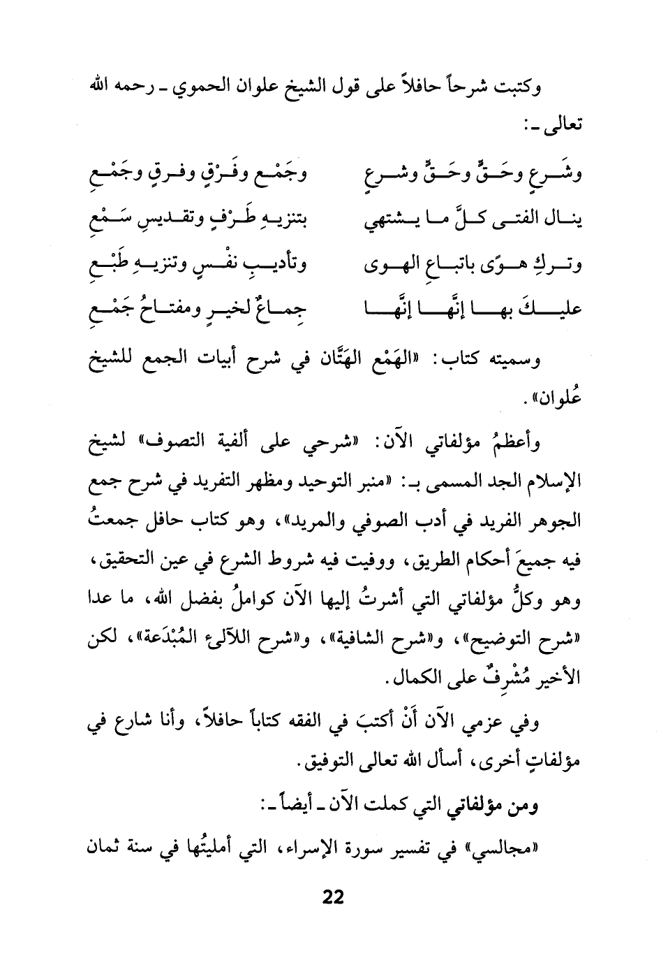 وأعظمُ مؤلفاتي الآن: "شرحي على ألفية التصوف" لشيخ الإسلام الجد المسمى بـ: "منبر التوحيد ومظهر التفريد في شرح جمع الجوهر الفريد في أدب الصوفي والمريد"، وهو كتاب حافل جمعتُ فيه جميعَ أحكام الطريق، ووفيت فيه شروط الشرع في عين التحقيق، وهو وكلُّ مؤلفاتي التي أشرتُ إليها الآن كواملُ بفضل الله، ما عدا "شرح التوضيح"، و"شرح الشافيه", و"شرح اللآلئ المُبْدَعة"، لكن الأخير مُشْرِفٌ على الكمال.