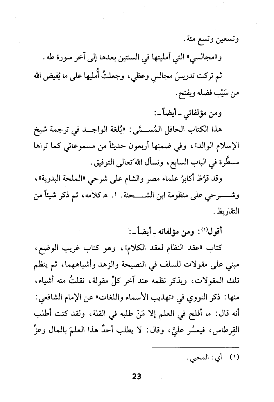 هذا الكتاب الحافل المُسمَّى: "بُلغة الواجد في ترجمة شيخ الإسلام الوالد"، وفي ضمنها أربعون حديثاً من مسموعاتي كما تراها مسطَّرة في الباب السابع، ونسأل اللهَ تعالى التوفيق.