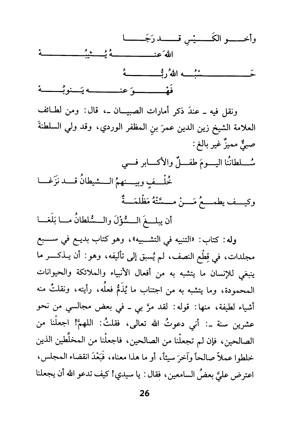ونقل فيه - عندَ ذكر أمارات الصبيان -، قال: ومن لطائف العلامة الشيخ زين الدين عمرَ بنِ المظفر الوردي، وقد ولي السلطنةَ صبيٌّ مميزٌ غير بالغ: