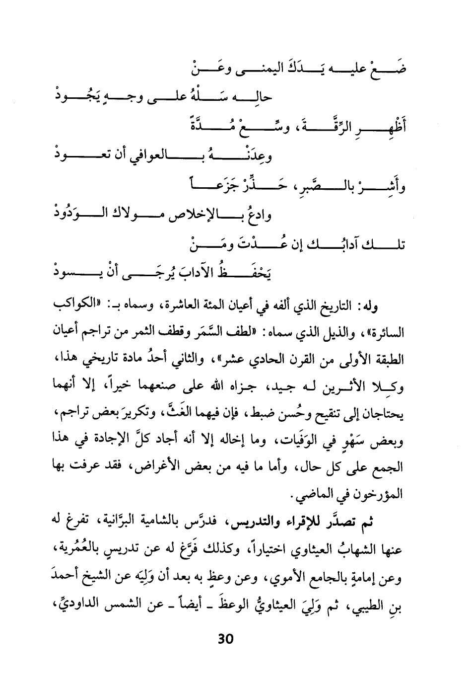 وله: التاريخ الذي ألفه في أعيان المئة العاشرة، وسماه بـ: "الكواكب السائرة"، والذيل الذي سماه: "لطف السَّمَر وقطف الثمر من تراجم أعيان الطبقة الأولى من القرن الحادي عشر"، والثاني أحدُ مادة تاريخي هذا، وكِلا الأثرين له جيد، جزاه الله على صنعهما خيراً، إلا أنهما يحتاجان إلى تنقيح وحُسن ضبط، فإن فيهما الغَثَّ، وتكريرَ بعض تراجم، وبعض سَهْوٍ في الوَفَيات، وما إخاله إلا أنه أجاد كلَّ الإجادة في هذا الجمع على كل حال، وأما ما فيه من بعض الأغراض، فقد عرفت بها المؤرخون في الماضي.