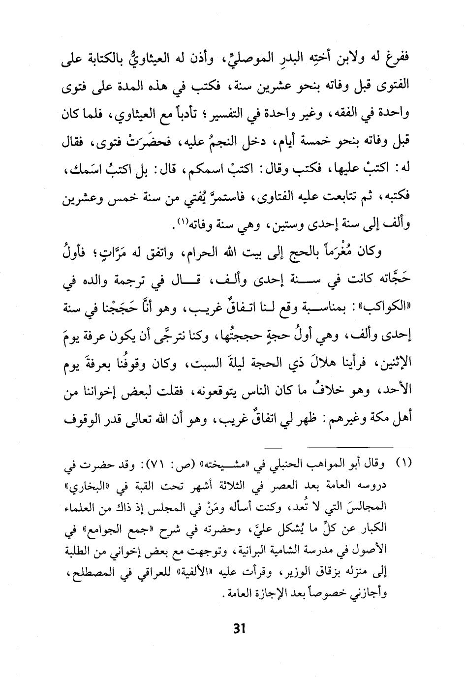 ففرغ له ولابن أختِه البدرِ الموصلىِّ، وأذن له العيثاويُّ بالكتابة على الفتوى قبل وفاته بنحو عشرين سنة، فكتب في هذه المدة على فتوى واحدة في الفقه، وغير واحدة في التفسير؛ تأدبا مع العيثاوي، فلما كان قبل وفاته بنحو خمسة أيام، دخل النجمُ عليه، فحضَرَتْ فتوى، فقال له: اكتبْ عليها، فكتب وقال: اكتبْ اسمكم، قال: بل اكتبُ اسَمك، فكتبه، ثم تتابعت عليه الفتاوى، فاستمرَّ يُفتي من سنة خمس وعشرين وألف إلى سنة إحدى وستين، وهي سنة وفاته (¬1).