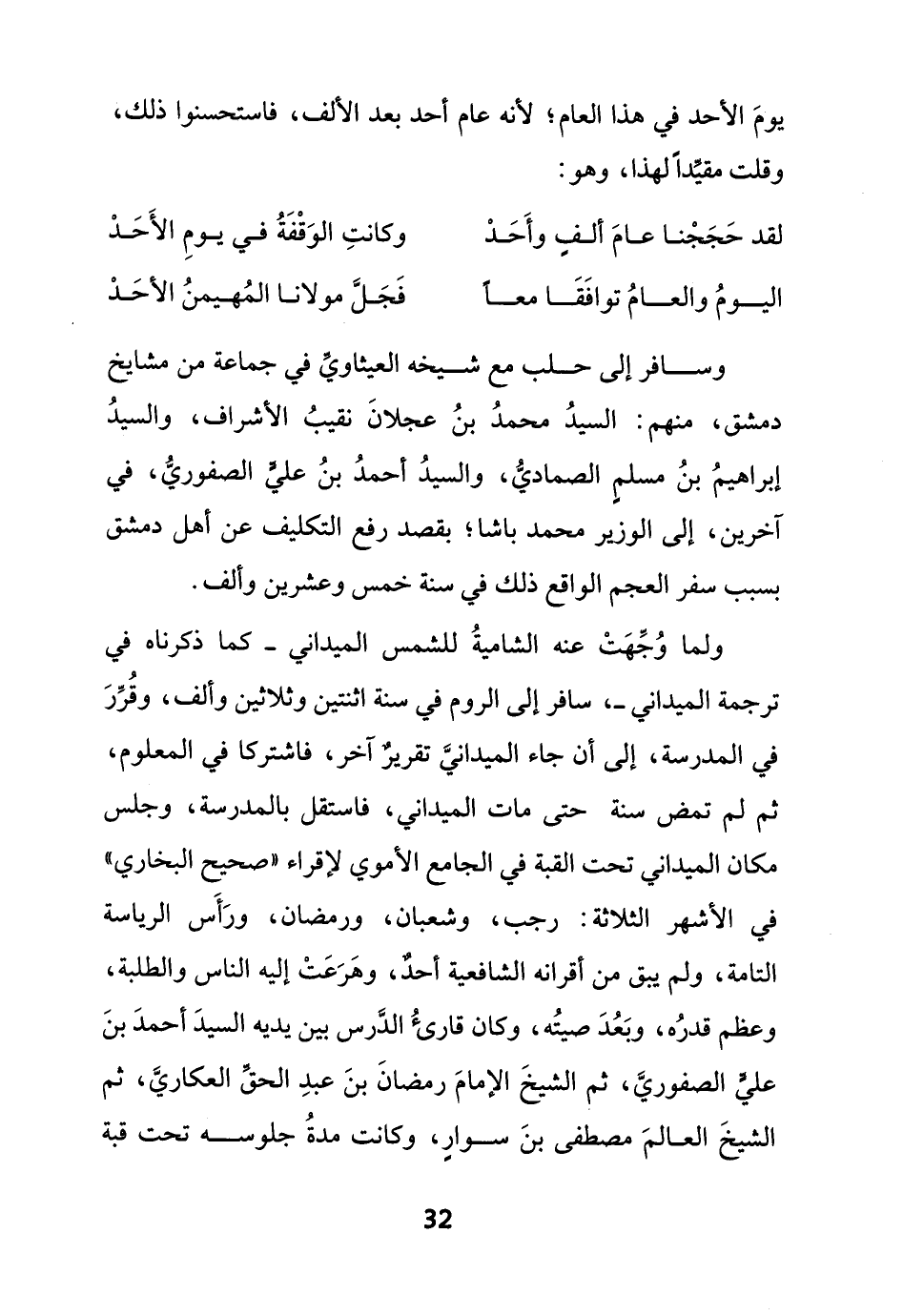 وسافر إلى حلب مع شيخه العيثاويِّ في جماعة من مشايخ دمشق، منهم: السيدُ محمدُ بنُ عجلانَ نقيبُ الأشراف، والسيدُ إبراهيمُ بنُ مسلمٍ الصماديُّ، والسيدُ أحمدُ بنُ على الصفوريُّ، في آخرين، إلى الوزير محمد باشا؛ بقصد رفع التكليف عن أهل دمشق بسبب سفر العجم الواقع ذلك في سنة خمس وعشرين وألف.