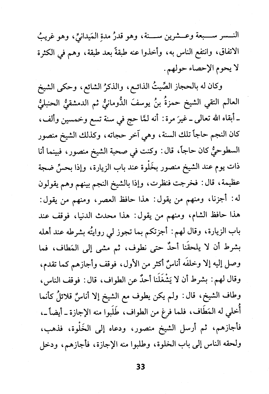 وكان له بالحجاز الصِّيتُ الذائع، والذكرُ الشائع، وحكى الشيخ العالم التقي الشيخ حمزةُ بنُ يوسفَ الدُّومانيُّ ثم الدمشقيُّ الحنبليُّ - أبقاه الله تعالى - غيرَ مرة: أنه لمَّا حج في سنة تسع وخمسين وألف، كان النجم حاجاً تلك السنة، وهي آخر حجاته، وكذلك الشيخ منصور السطوحيُّ كان حاجاً، قال: وكنت في صحبة الشيخ منصور، فبينما أنا ذات يوم عند الشيخ منصور بخَلْوة عند باب الزيارة، وإذا بحسِّ ضجة عظيمة، قال: فخرجت فنظرت، وإذا بالشيخ النجم بينهم وهم يقولون له: أجزنا، ومنهم من يقول: هذا حافظ العصر، ومنهم من يقول: هذا حافظ الشام، ومنهم من يقول: هذا محدث الدنيا، فوقف عند باب الزيارة، وقال لهم: أجزتكم بما تجوز لي روايتُه بشرطه عند أهله بشرط أن لا يلحقَنا أحدٌ حتى نطوف، ثم مشى إلى المَطاف، فما وصل إليه إلا وخلفَه أناسٌ أكثر من الأول، فوقف وأجازهم كما تقدم، وقال لهم: بشرط أن لا يَشْغَلَنا أحدٌ عن الطواف، قال: فوقف الناس، وطاف الشيخ، قال: ولم يكن يطوف مع الشيخ إلا أناسٌ قلائلُ كأنما أُخلي له المَطَاف، فلما فرغ من الطواف، طَلَبوا منه الإجازة - أيضاً -، فأجازهم، ثم أرسل الشيخ منصور، ودعاه إلى الخَلْوة، فذهب، ولحقه الناس إلى باب الخلوة، وطلبوا منه الإجازة، فأجازهم، ودخل
