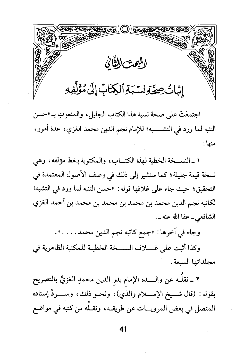 اجتمعَتْ على صحة نسبة هذا الكتاب الجليل، والمنعوتِ بـ "حسن التنبه لما ورد في التشبه" للإمام نجم الدين محمد الغزي، عدة أمور، منها: