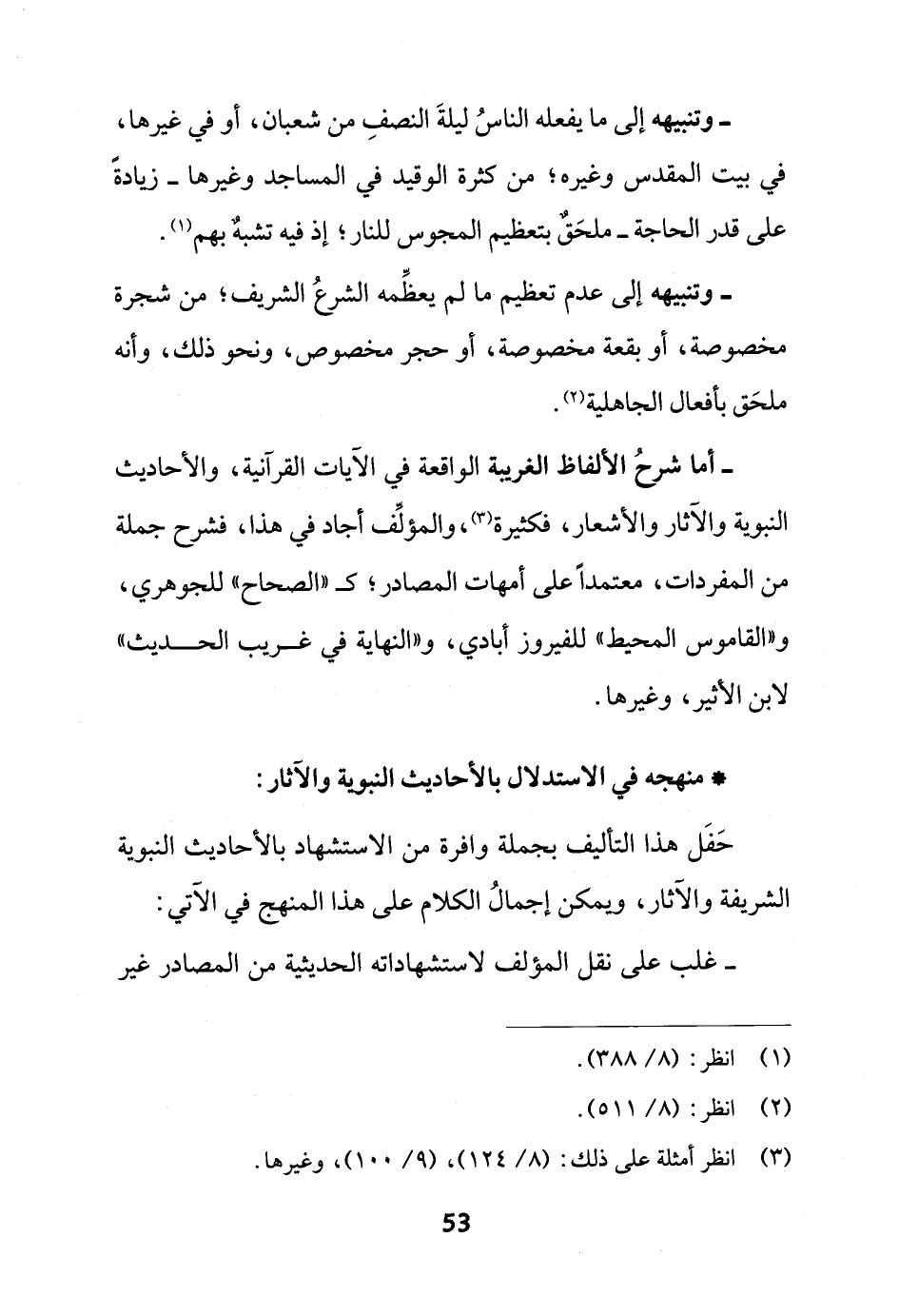 - أما شرحُ الألفاظ الغريبة الواقعة في الآيات القرآنية، والأحاديث النبوية والآثار والأشعار، فكثيرة (¬3)، والمؤلِّف أجاد في هذا، فشرح جملة من المفردات، معتمداً على أمهات المصادر؛ كـ"الصحاح" للجوهري، و"القاموس المحيط" للفيروز أبادي، و"النهاية في غريب الحديث" لابن الأثير، وغيرها.