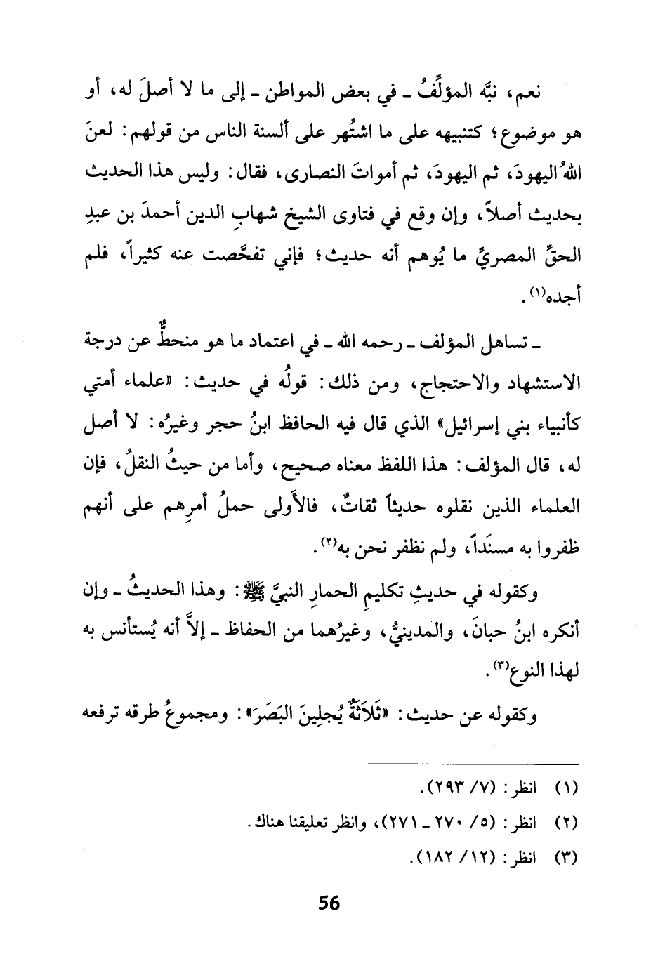 - تساهل المؤلف - رحمه الله - في اعتماد ما هو منحطٌّ عن درجة الاستشهاد والاحتجاج، ومن ذلك: قولُه في حديث: "علماء أمتي كأنبياء بني إسرائيل" الذي قال فيه الحافظ ابنُ حجر وغيرُه: لا أصل له، قال المؤلف: هذا اللفظ معناه صحيح، وأما من حيثُ النقلُ، فإن العلماء الذين نقلوه حديثاً ثقاثٌ، فالأَولى حملُ أمرِهم على أنهم ظفروا به مسنَداً، ولم نظفر نحن به (¬2).
