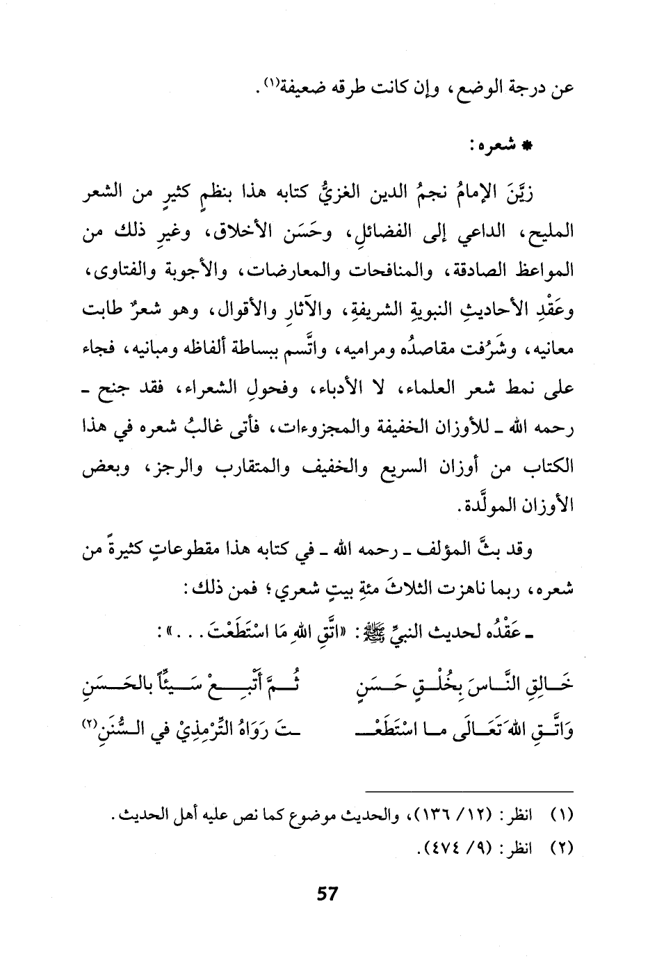 زَّينَ الإمامُ نجمُ الدين الغزيُّ كتابه هذا بنظمٍ كثيرٍ من الشعر المليح، الداعي إلى الفضائلِ، وحَسَن الأخلاق، وغيرِ ذلك من المواعظ الصادقة، والمنافحات والمعارضات، والأجوبة والفتاوى، وعَقْدِ الأحاديثِ النبويةِ الشريفةِ، والآثارِ والأقوال، وهو شعرٌ طابت معانيه، وشَرُفت مقاصدُه ومراميه، واتَّسم ببساطة ألفاظه ومبانيه، فجاء على نمط شعر العلماء، لا الأدباء، وفحولِ الشعراء، فقد جنح - رحمه الله - للأوزان الخفيفة والمجزوءات، فأتى غالبُ شعره في هذا الكتاب من أوزان السريع والخفيف والمتقارب والرجز، وبعض الأوزان المولَّدة.