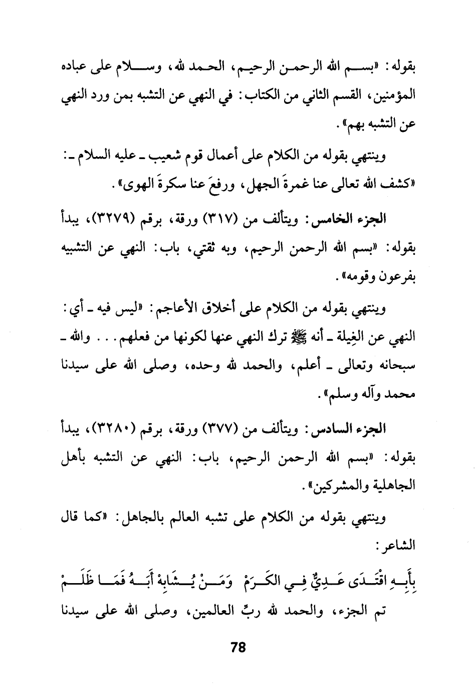 الجزء السادس: ويتألف من (377) ورقة، برقم (3280)، يبدأ بقوله: "بِسْمِ اللَّهِ الرَّحْمَنِ الرَّحِيمِ، باب: النهي عن التشبه بأهل الجاهلية والمشركين".