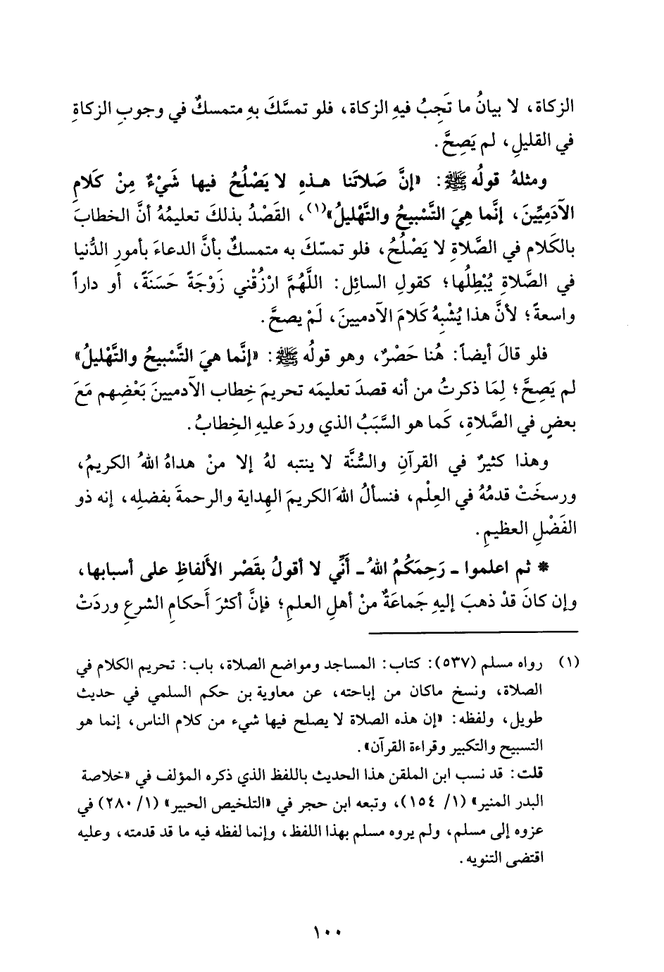 ومثلهُ قولُه - صلى الله عليه وسلم -: "إن صَلاتَنا هذهِ لا يَصْلُحُ فيها شَيء مِنْ كَلامِ الآدَمِيِّينَ، إنَّما هِيَ التسبيحُ والتهْليلُ" (¬1)، القَصْدُ بذلكَ تعليمُهُ أنَّ الخطابَ بالكَلام في الصَّلاةِ لا يَصْلُحُ، فلو تمسّكَ به متمسك بانَّ الدعاءَ بأمورِ الدُّنيا في الصَّلاةِ يُبْطِلُها؛ كقولِ السائِل: اللَّهُمَ ارْزُقْني زَوْجَة حَسَنَة، أو دارًا واسعة؛ لأنَّ هذا يُشْبِهُ كَلامَ الآدميينَ، لَمْ يصحَّ.
