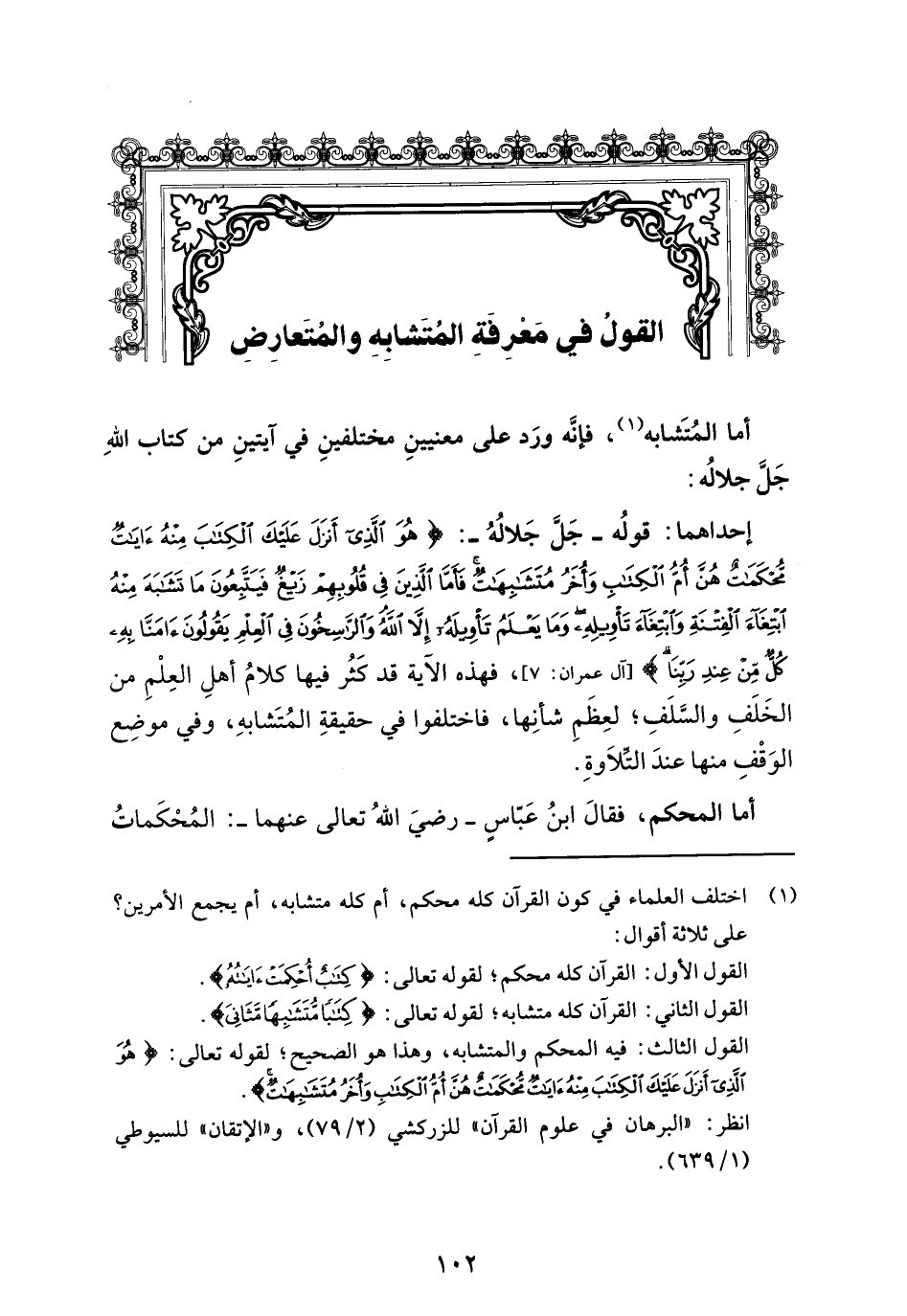 إحداهما: قولُه -جل جَلالُهُ-: {هُوَ الَّذِي أَنْزَلَ عَلَيْكَ الْكِتَابَ مِنْهُ آيَاتٌ مُحْكَمَاتٌ هُنَّ أُمُّ الْكِتَابِ وَأُخَرُ مُتَشَابِهَاتٌ فَأَمَّا الَّذِينَ فِي قُلُوبِهِمْ زَيْغٌ فَيَتَّبِعُونَ مَا تَشَابَهَ مِنْهُ ابْتِغَاءَ الْفِتْنَةِ وَابْتِغَاءَ تَأْوِيلِهِ وَمَا يَعْلَمُ تَأْوِيلَهُ إِلَّا اللَّهُ وَالرَّاسِخُونَ فِي الْعِلْمِ يَقُولُونَ آمَنَّا بِهِ كُلٌّ مِنْ عِنْدِ رَبِّنَا وَمَا يَذَّكَّرُ إِلَّا أُولُو الْأَلْبَابِ (7)} [آل عمران: 7] فهذه الآية قد كَثُر فيها كلامُ أهلِ العِلْمِ من الخَلَفِ والسَّلَفِ؛ لعِظَمِ شأنِها، فاختلفوا في حقيقةِ المُتَشابهِ، وفي موضِع الوَقْفِ منها عندَ التّلاَوةِ.