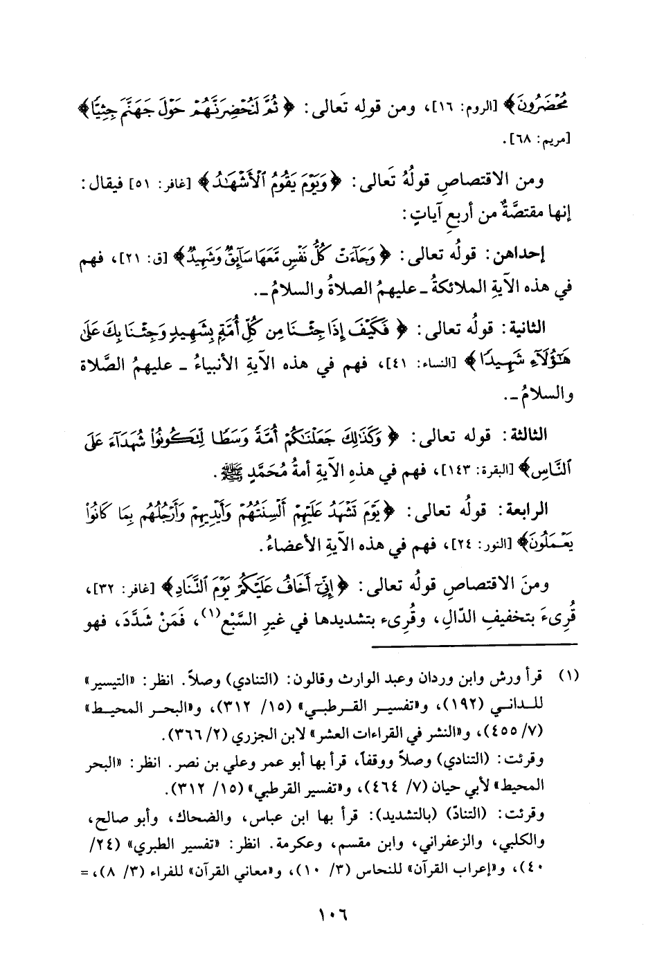 ومنَ الاقتصاصِ قولُه تعالى: {إِنِّي أَخَافُ عَلَيْكُمْ يَوْمَ التَّنَادِ} [غافر: 32] , قُرِئَ بتخفيفِ الدالِ، وقُرِئ بتشديدها في غيرِ السَّبعْ (¬1)، فَمَنْ شَدَّدَ، فهو
