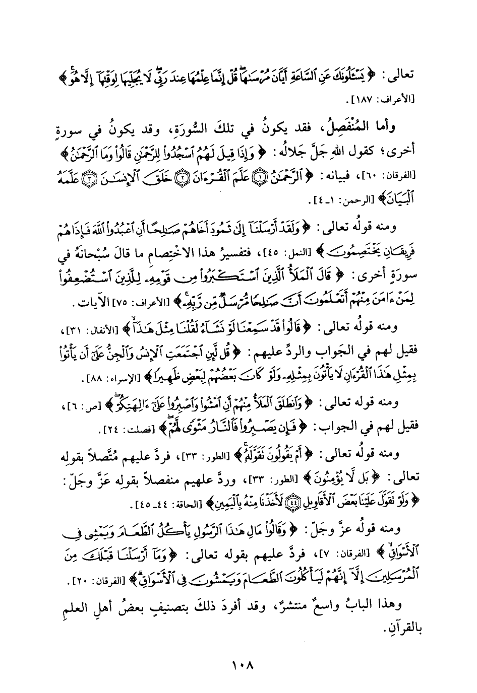 وأمَّا المُنْفَصِلُ، فقد يكونُ في تلكَ السُّورَةِ، وقد يكونُ في سورةٍ أخرى؛ يقول اللهِ جَل جَلالُه: {وَإِذَا قِيلَ لَهُمُ اسْجُدُوا لِلرَّحْمَنِ قَالُوا وَمَا الرَّحْمَنُ} [الفرقان: 60]، فبيانه: {الرَّحْمَنُ (1) عَلَّمَ الْقُرْآنَ (2) خَلَقَ الْإِنْسَانَ (3) عَلَّمَهُ الْبَيَانَ} [الرحمن: 1 - 4].