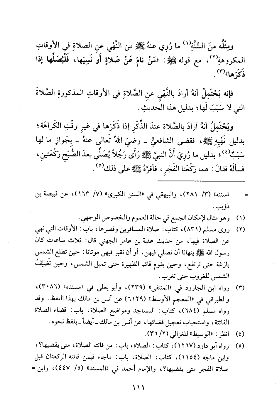 ومثْلُه منَ السنَّةِ (¬1) ما رُوِي عنهُ - صلى الله عليه وسلم - من النَّهْي عنِ الصلاةِ في الأوقاتِ المكروهةِ (¬2)، مع قوله - صلى الله عليه وسلم -: "مَنْ نامَ عَنْ صَلاةٍ أَو نَسِيَها، فَلْيصَلِّها إذا ذَكَرَها" (¬3).