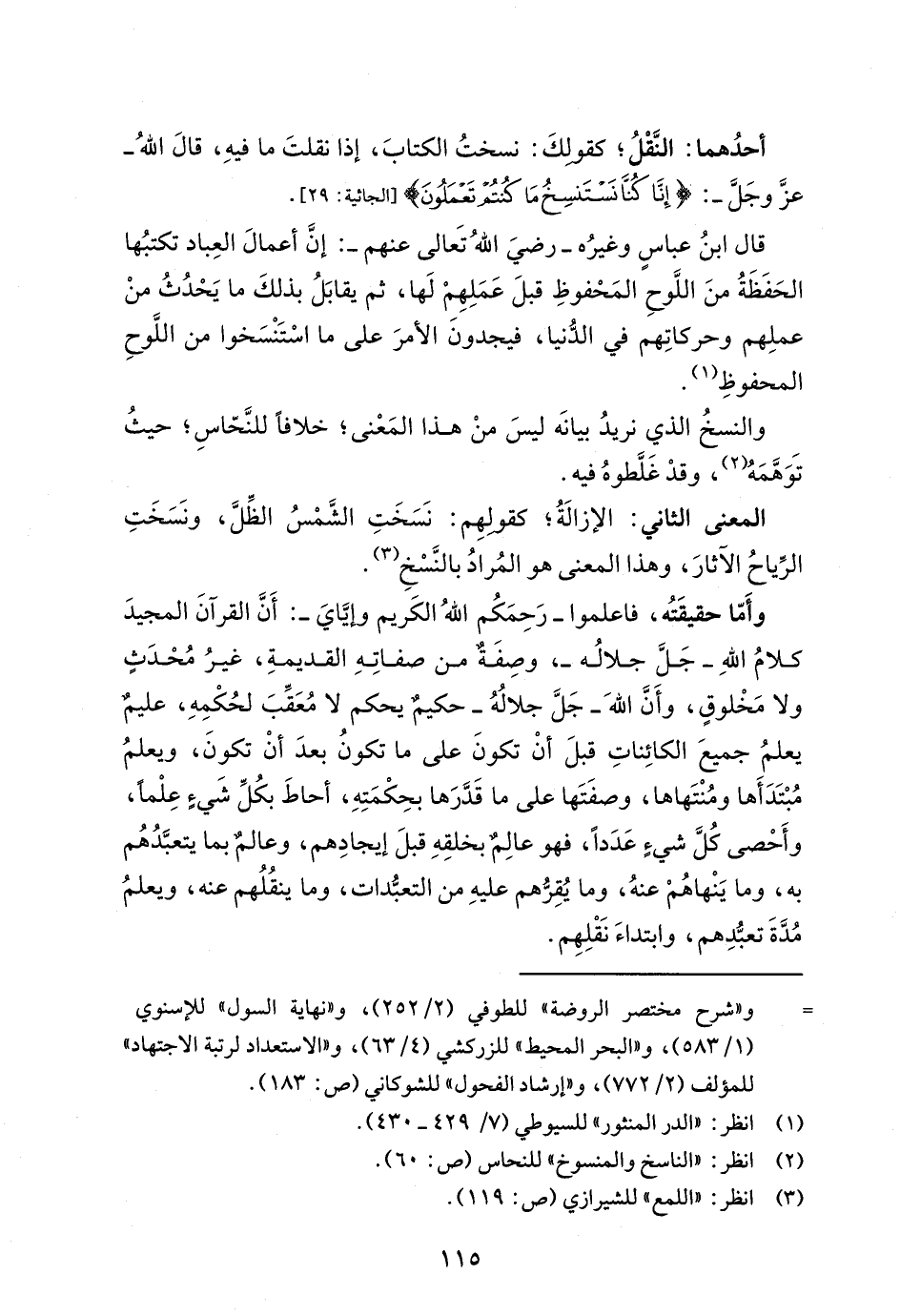 المعنى الثَّاني: الإزالَةُ؛ كقولهِم: نَسَخَتِ الشَّمْسُ الظِّلَّ، ونَسَخَتِ الرِّياحُ الآثارَ، وهذا المعنى هو المُرادُ بالنَّسْخِ (¬3).