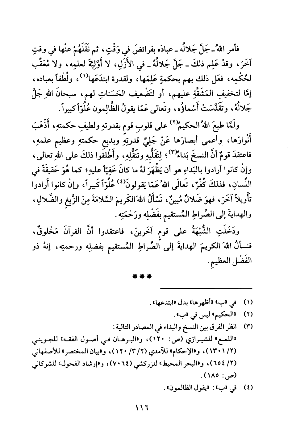 ولَمَّا طبعَ اللهُ الحكيمُ (¬2) على قلوبِ قومٍ بقدرتهِ ولطيفِ حكمتهِ، أَذْهَبَ أَنْوارَها، وأعمى أبصارَها عَنْ جَلِيِّ قدرتهِ وبديع حكمتهِ وعظيمِ علمهِ، فاعتقدَ قومٌ أنَّ النسخَ بَداءٌ (¬3)؛ لِتَقَلُّبهِ وتنَقُّلِهِ، وأَطْلقَوا ذلكَ على اللهِ تعالى، وإنْ كانوا أرادوا بالبَداءِ هو أن يَظْهَرَ لهُ ما كانَ خَفِيًّا عليهِ؛ كما هُوَ حَقيقَةً في اللّسانِ، فذلكَ كُفْرٌ، تَعالَى اللهُ عَمَّا يَقولونَ (¬4) عُلُوًّا كَبيراً، وإنْ كانوا أَرادوا تأويلاً آخَرَ، فهوَ ضَلالٌ مُبينٌ، نَسْألُ اللهَ الكَريمَ السَّلامَةَ مِنَ الزَّيغِ والضَّلالِ، والهدايةَ إلى الصِّراطِ المُستقيمِ بفَضْلِه ورَحْمَتِه.