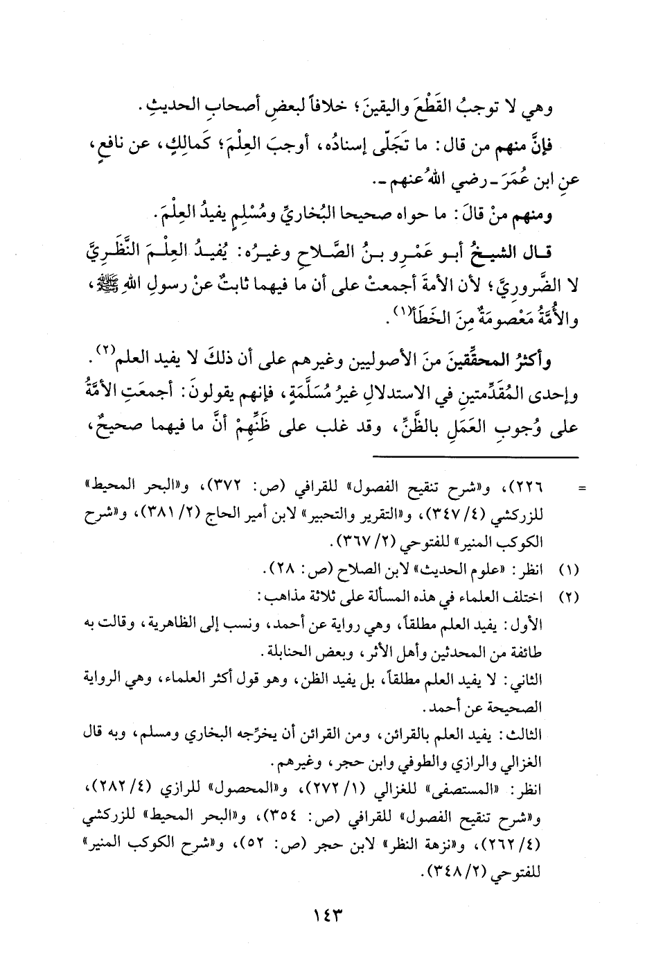 فإنَّ منهم من قال: ما تَجَلّى إسنادُه، أوجبَ العِلْمَ؛ كَمالِكٍ، عن نافعٍ، عنِ ابن عُمَرَ- رضي اللهُ عنهم-.