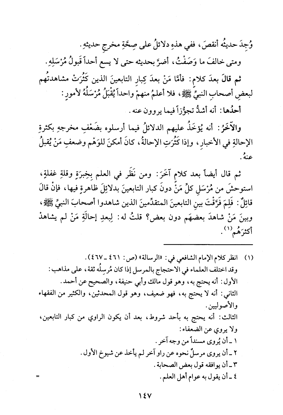 ثم قالَ بعدَ كلامٍ: فأمَّا مَنْ بعدَ كِبارِ التَّابعينَ الذين كَثُرَتْ مشاهدتُهم لبعضِ أصحابِ النبيِّ - صلى الله عليه وسلم -، فلا أعلمُ منهمْ واحدًا يُقْبَلُ مُرْسَلُهُ لأمورٍ: