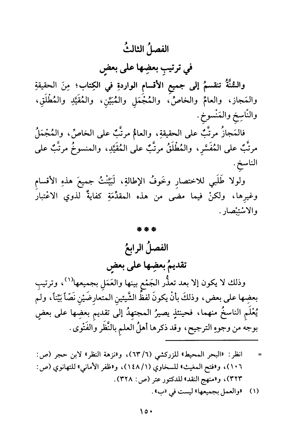 فالمَجازُ مرتَّبٌ على الحقيقةِ، والعامُّ مرتَّبٌ على الخاصِّ، والمُجْمَلُ مرتَّبٌ على المُفَسَّرِ، والمُطْلَقُ مرتَّبٌ على المُقَيَّدِ، والمنسوخُ مرتَّبٌ على الناسخِ.