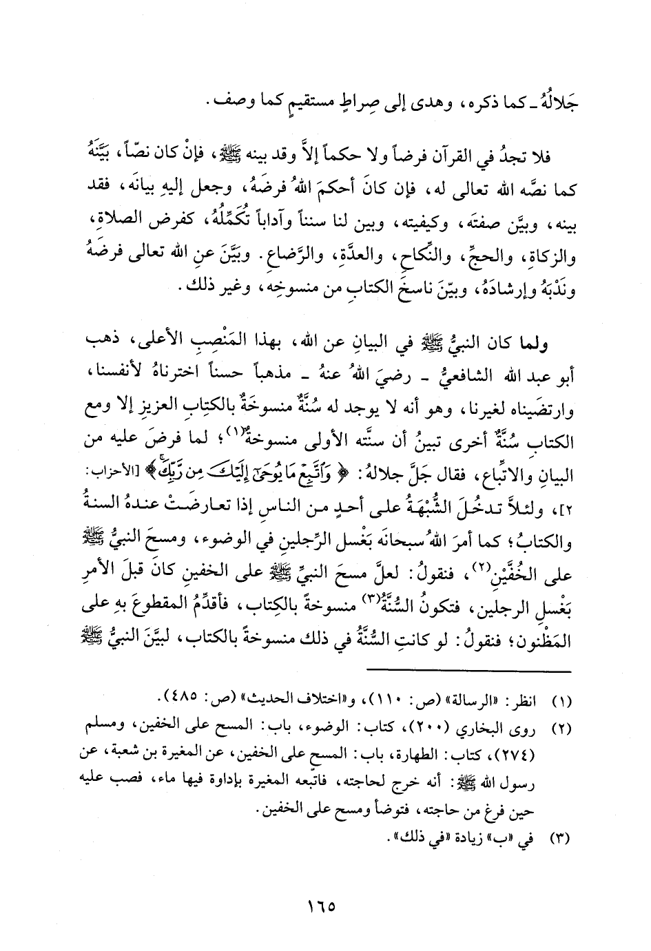 ولما كان النبيُّ - صلى الله عليه وسلم - في البيانِ عن الله، بهذا المَنْصِبِ الأعلى، ذهب أبو عبد الله الشافعيُّ -رضيَ اللهُ عنهُ- مذهبًا حسنا اخترناهُ لأنفسنا، وارتضَيناه لغيرنا، وهو أنه لا يوجد له سُنَّةٌ منسوخَةٌ بالكتِابِ العزيزِ إلا ومع الكتابِ سُنَّةٌ أخرى تبينُ أن سنَّته الأولى منسوخةٌ (¬1)؛ لما فرضَ عليه من البيانِ والاتّباع، فقال جَلَّ جلالهُ: {وَاتَّبِعْ مَا يُوحَى إِلَيْكَ مِنْ رَبِّكَ} [الأحزاب: 2]، ولئلَّا تدخُلَ الشُّبْهَةُ على أحدٍ من الناسِ إذا تعارضَتْ عندهُ السنةُ والكتابُ؛ كما أمرَ اللهُ سبحانَه بَغْسل الرِّجلينِ في الوضوء، ومسحِ النبيُّ - صلى الله عليه وسلم - على الخُفَّيْنِ (¬2)، فنقولُ: لعلَّ مسحَ النبيِّ - صلى الله عليه وسلم - على الخفينِ كان قبلَ الأمرِ بَغْسلِ الرجلين، فتكونُ السُّنَّةُ (¬3) منسوخةً بالكِتاب، فأقدِّمُ المقطوعَ بهِ على المَظْنون؛ فنقولُ: لو كانتِ السُّنَّةُ في ذلك منسوخةً بالكتاب، لبيَّنَ النبيُّ - صلى الله عليه وسلم -