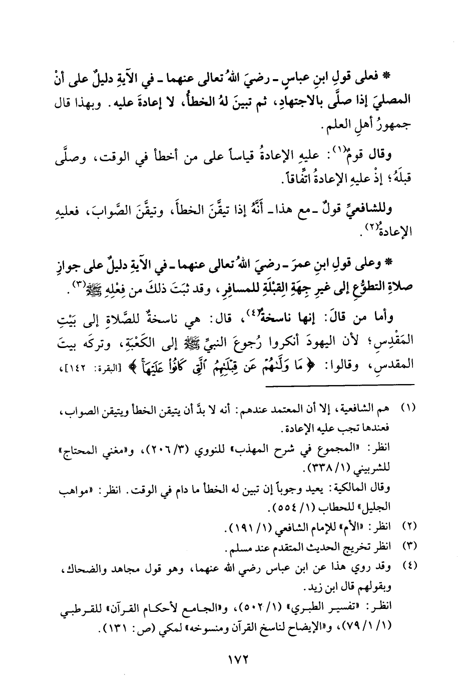 * وعلى قولِ ابنِ عمرَ -رضيَ اللهُ تعالى عنهما- في الآيةِ دليل على جوازِ صلاةِ التطوُّعِ إلى غيرِ جِهَةِ الِقبْلَةِ للمسافِرِ، وقد ثبَتَ ذلكَ من فِعْلِهِ - صلى الله عليه وسلم - (¬3).