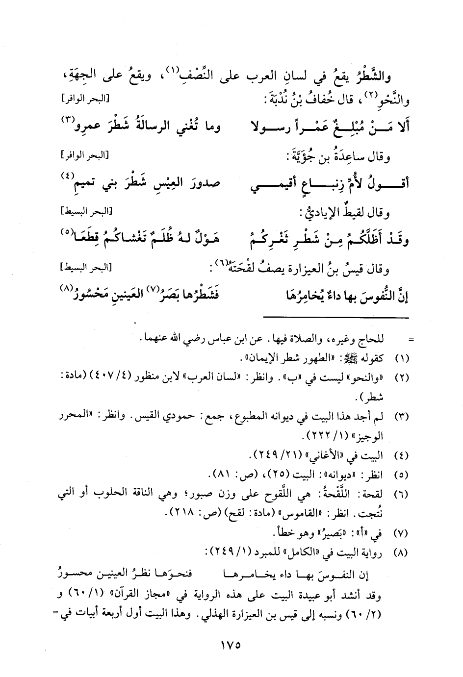 والشَّطْرُ يقعُ في لسانِ العرب على النِّصْفِ (¬1)، ويقعُ على الجِهَةِ، والنَّحْوِ (¬2)، قال خُفافُ بْنُ نُدْبَةَ: [البحر الوافر]