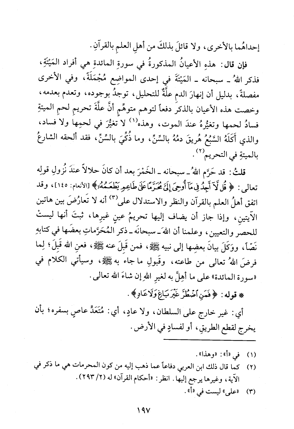 قلتُ: قد حَرَّم اللهُ -سبحانه- الخَمْرَ بعد أن كانَ حلالًا عندَ نُزولِ قولِه تعالى: {قُلْ لَا أَجِدُ فِي مَا أُوحِيَ إِلَيَّ مُحَرَّمًا عَلَى طَاعِمٍ يَطْعَمُهُ} [الأنعام: 145]، وقد اتفق أهلُ العلم بالقرآن والنظر والاستدلال على (¬3) أنه لا تَعارُضَ بين هاتين الآيتينِ، وإذا جاز أن يضاف إليها تحريمُ عينٍ غيرِها، ثبتَ أنها ليستْ للحصر والتعيين، وعلمنا أن الله -سبحانَه- ذكر المُحَرَّماتِ بعضَها في كتابهِ نَصًّا، ووَكَلَ بيانَ بعضِها إلى نبيه - صلى الله عليه وسلم -، فمن قَبِلَ عنه - صلى الله عليه وسلم -، فعنِ الله قَبِلَ؛ لِما فرضَ اللهُ تعالى من طاعته، وقَبولِ ما جاء به - صلى الله عليه وسلم -، وسيأتي الكلام في "سورة المائدة" على ما أهِلَّ به لغيرِ اللهِ إن شاءَ الله تعالى.