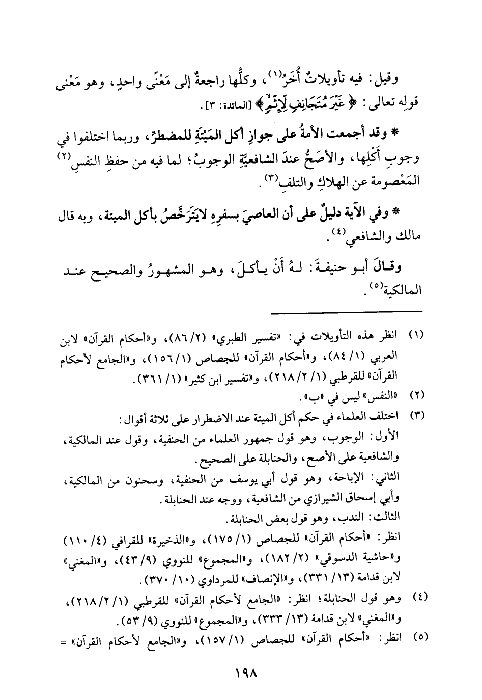 (¬3) اختلف العلماء في حكم أكل الميتة عند الاضطرار على ثلاثة أقوال: