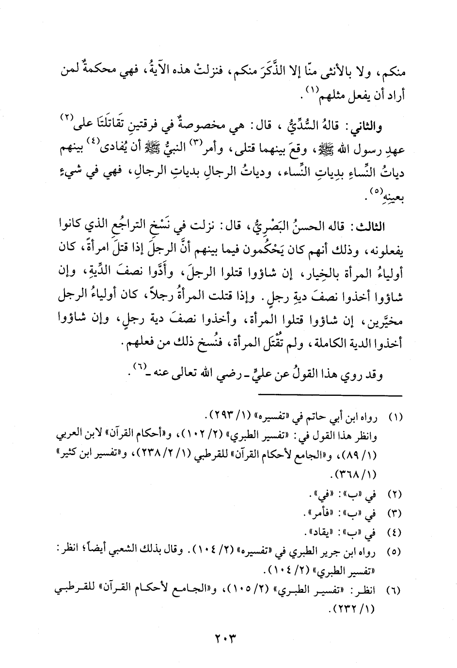 الثالث: قاله الحسنُ البَصْرِيُّ، قال: نزلت في نَسْخِ التراجُعِ الذي كانوا يفعلونه، وذلك أنهم كان يَحْكُمون فيما بينهم أنَّ الرجلَ إذا قتلَ امرأةً، كان أولياءُ المرأة بالخِيار، إن شاؤوا قتلوا الرجلَ، وأَدَّوا نصفَ الدِّيةِ، وإن شاؤوا أخذوا نصفَ ديةِ رجلٍ. وإذا قتلت المرأةُ رجلًا، كان أولياءُ الرجل مخيَّرين، إن شاؤوا قتلوا المرأة، وأخذوا نصفَ دية رجلٍ، وإن شاؤوا أخذوا الدية الكاملة، ولم تقتل المرأة، فنُسخ ذلك من فعلهم.