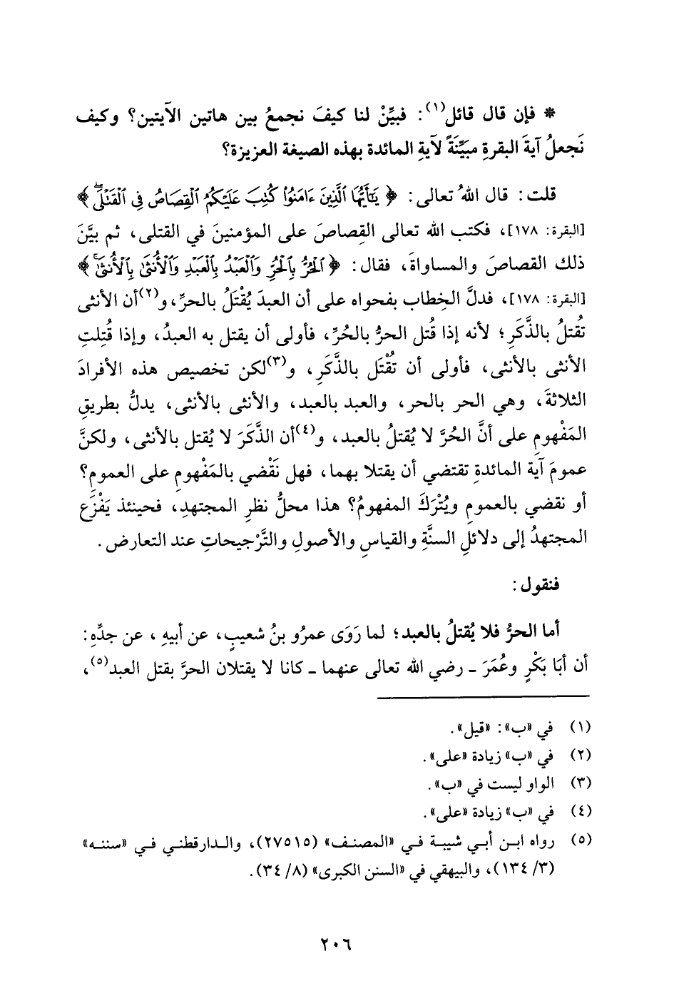 قلت: قال اللهُ تعالى: {يَاأَيُّهَا الَّذِينَ آمَنُوا كُتِبَ عَلَيْكُمُ الْقِصَاصُ فِي الْقَتْلَى} [البقرة: 178]، فكتب الله تعالى القِصاصَ على المؤمنينَ في القتلى، ثم بيَّنَ ذلك القصاصَ والمساواةَ، فقال: {الْحُرُّ بِالْحُرِّ وَالْعَبْدُ بِالْعَبْدِ وَالْأُنْثَى بِالْأُنْثَى} [البقرة: 178]، فدلَّ الخِطاب بفحواه على أن العبدَ يُقْتَلُ بالحرِّ، و (¬2) أن الأنثى تُقتلُ بالذَّكَرِ؛ لأنه إذا قُتل الحرُّ بالحُرِّ، فأولى أن يقتل به العبدُ، وإذا قُتِلتِ الأنثى بالأنثى، فأولى أن تُقْتَل بالذَّكَرِ، و (¬3) لكن تخصيص هذه الأفرادَ الثلاثةَ، وهي الحر بالحر، والعبد بالعبد، والأنثى بالأنثى، يدلُّ بطريقِ المَفْهوم على أنَّ الحُرِّ لا يُقتلُ بالعبد، و (¬4) أن الذَّكَرَ لا يُقتل بالأنثى، ولكنَّ عمومَ آيَة المائدةِ تقتضي أن يقتلا بهما، فهل نَقْضي بالمَفْهومِ على العمومِ؟ أو نقضي بالعمومِ ويُتْرَكَ المفهومُ؟ هذا محلُّ نظرِ المجتهدِ، فحينئذ يَفْزَع المجتهدُ إلى دلائلِ السنَّةِ والقياسِ والأصولِ والتَّرْجيحاتِ عند التعارض.