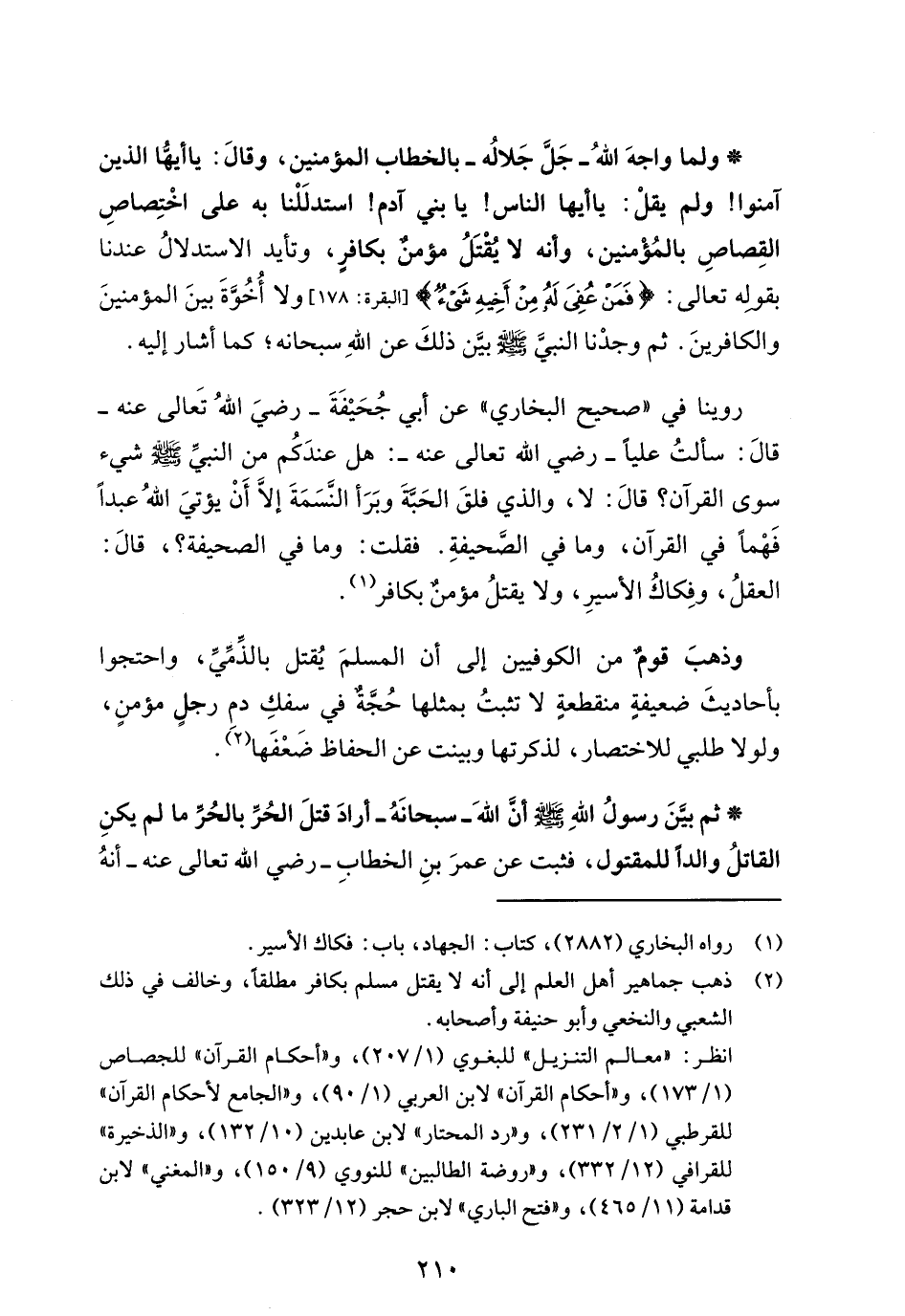 (¬2) ذهب جماهير أهل العلم إلى أنه لا يقتل مسلم بكافر مطلقاً، وخالف في ذلك الشعبي والنخعي وأبو حنيفة وأصحابه.