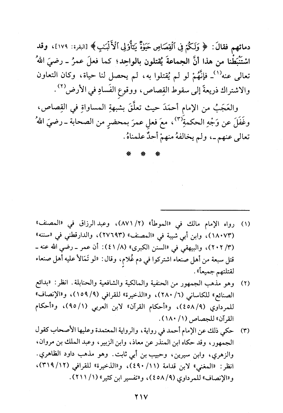 (¬1) رواه الإمام مالك في "الموطأ" (2/ 871)، وعبد الرزاق في "المصنف" (18073)، وابن أبي شيبة في "المصنف" (27693)، والدارقطني في "سننه" (3/ 202)، والبيهقي في "السنن الكبرى" (8/ 41): أن عمر -رضي الله عنه- قتل سبعة من أهل صنعاء اشتركوا في دم غُلامٍ، وقال: "لو تَمَالأ عليه أهل صنعاء لقتلتهم جميعاً".