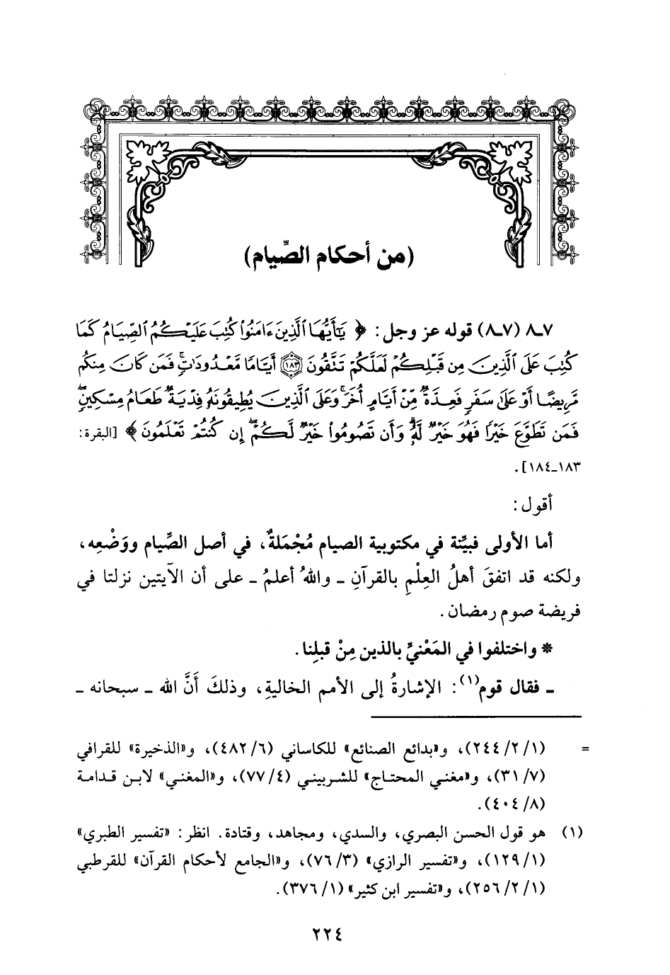7 - 8 (7 - 8) قوله عز وجل: {يَاأَيُّهَا الَّذِينَ آمَنُوا كُتِبَ عَلَيْكُمُ الصِّيَامُ كَمَا كُتِبَ عَلَى الَّذِينَ مِنْ قَبْلِكُمْ لَعَلَّكُمْ تَتَّقُونَ (183) أَيَّامًا مَعْدُودَاتٍ فَمَنْ كَانَ مِنْكُمْ مَرِيضًا أَوْ عَلَى سَفَرٍ فَعِدَّةٌ مِنْ أَيَّامٍ أُخَرَ وَعَلَى الَّذِينَ يُطِيقُونَهُ فِدْيَةٌ طَعَامُ مِسْكِينٍ فَمَنْ تَطَوَّعَ خَيْرًا فَهُوَ خَيْرٌ لَهُ وَأَنْ تَصُومُوا خَيْرٌ لَكُمْ إِنْ كُنْتُمْ تَعْلَمُونَ} [البقرة: 183 - 184].